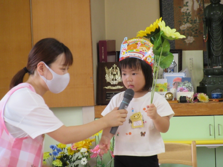 園長先生からお祝いの言葉をもらって、ひまわりを渡してもらったよ