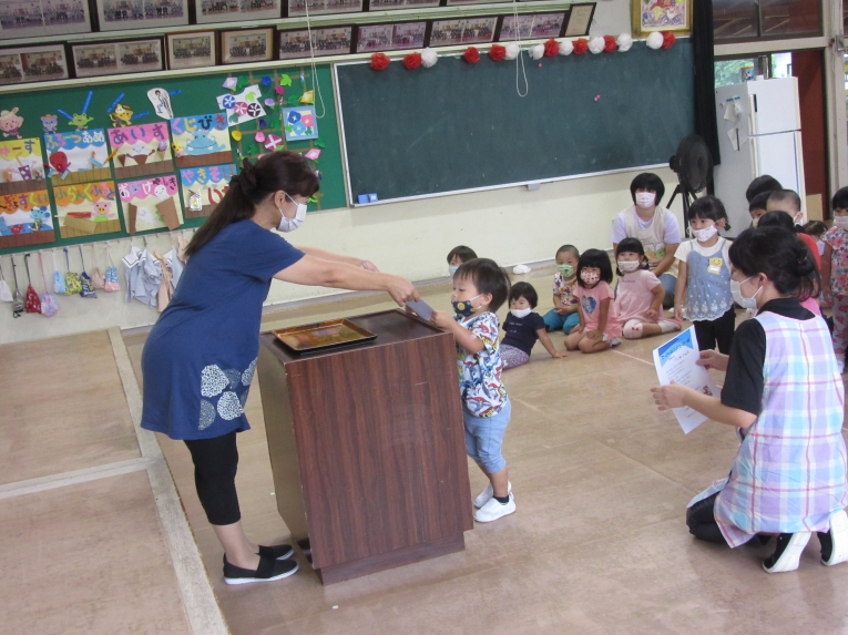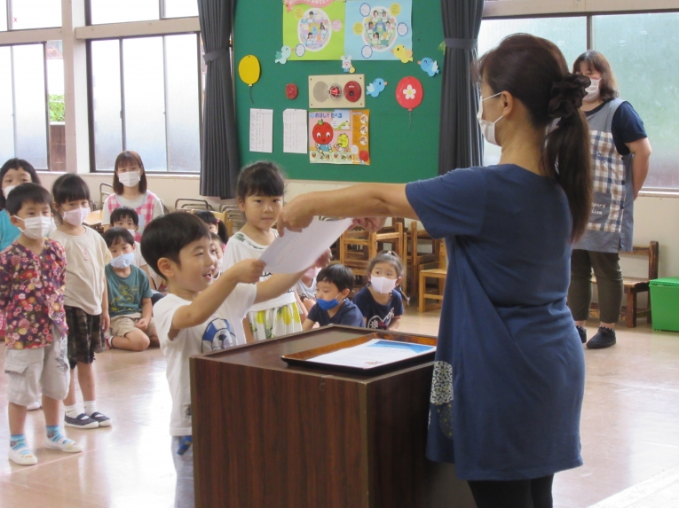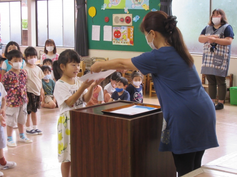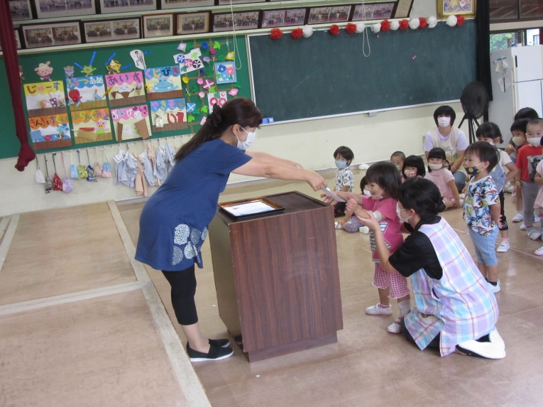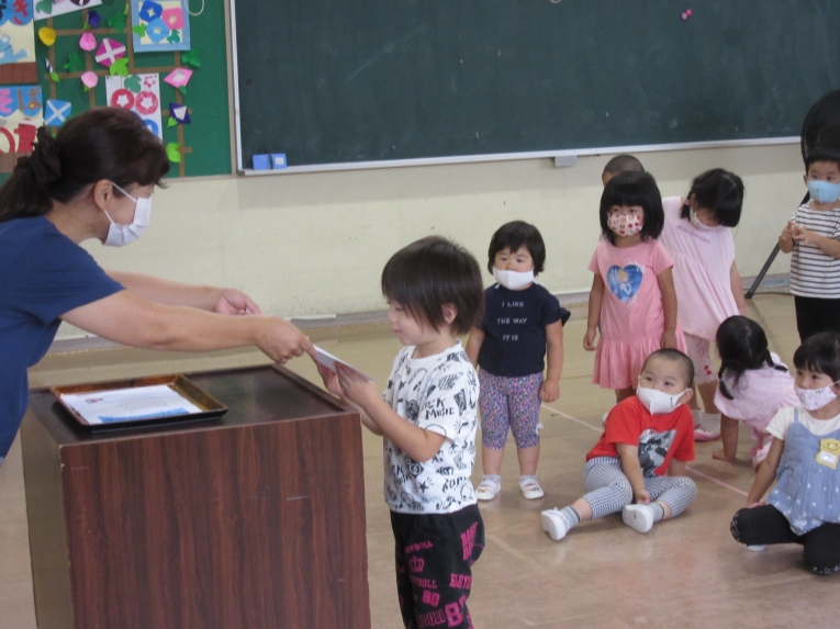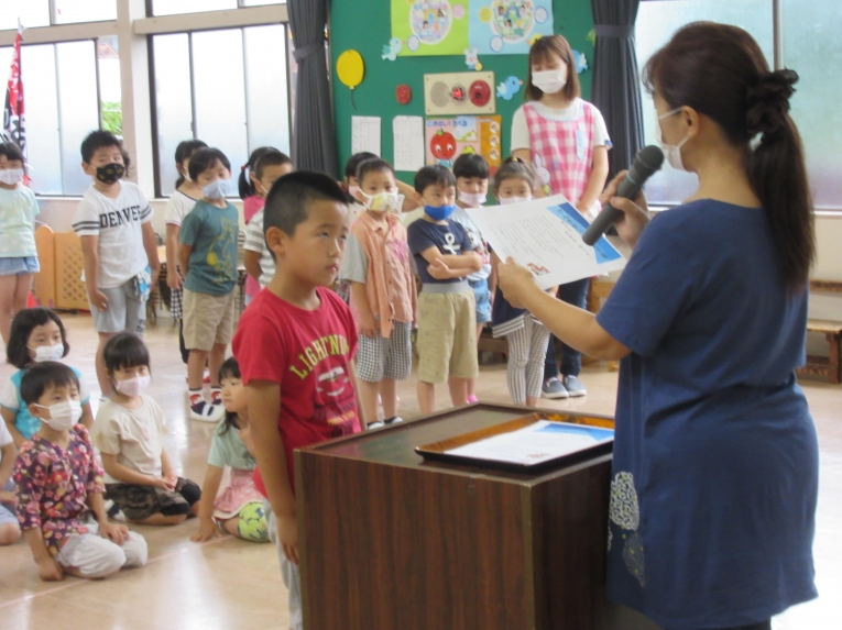 頑張ったみんなに園長先生より賞状が渡され、一学期のお休みが少なかったお友達が代表で受け取りました。