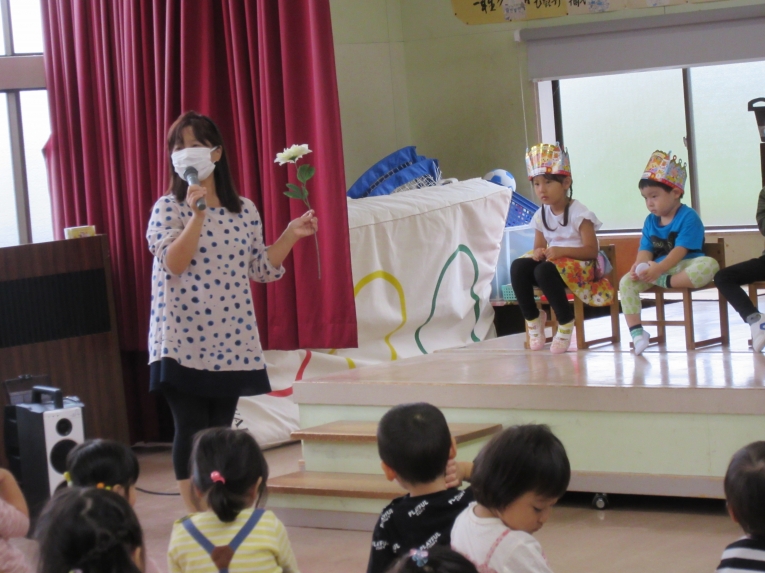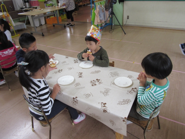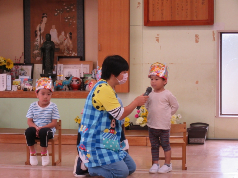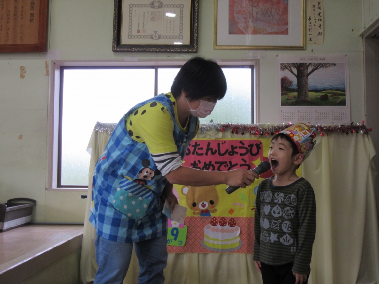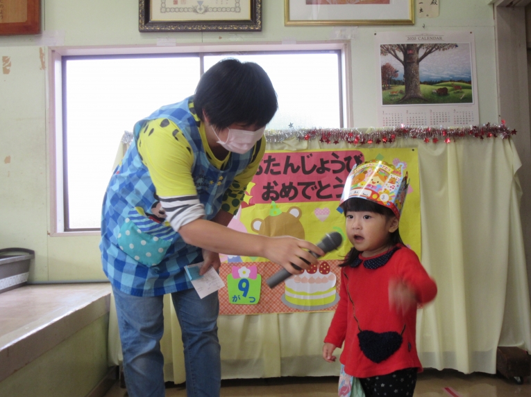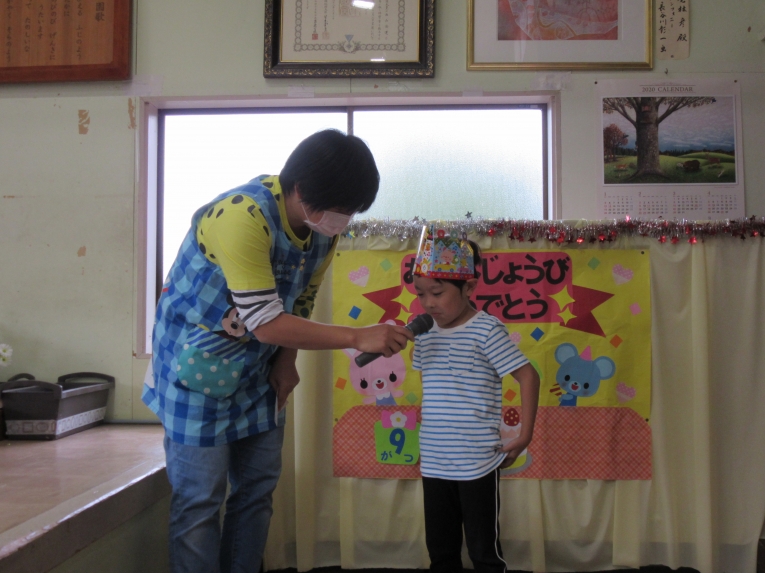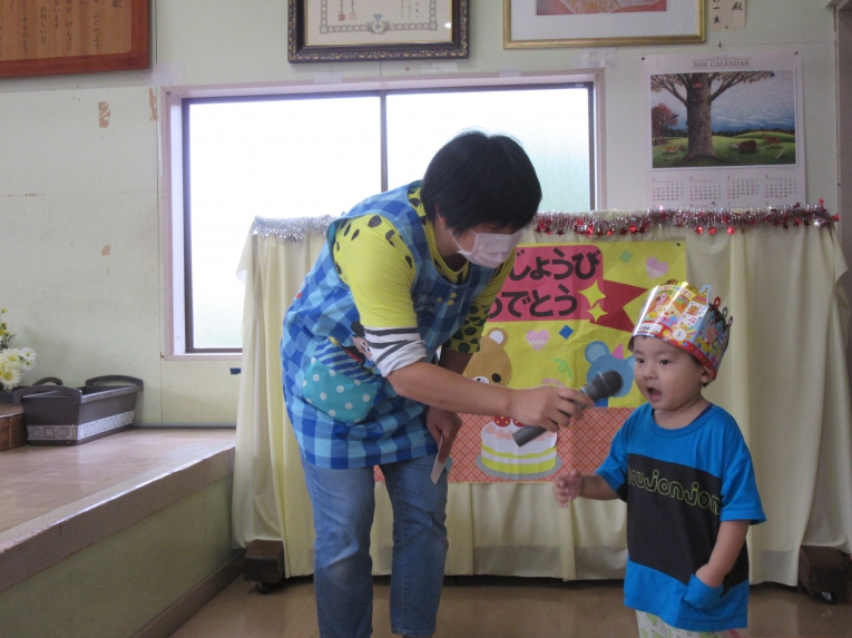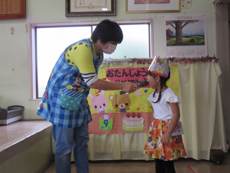 次はお誕生会の歌♪ そして一人一人へのインタビューです。お名前と好きな食べ物、動物・・・・ ちょっとだけ緊張する?