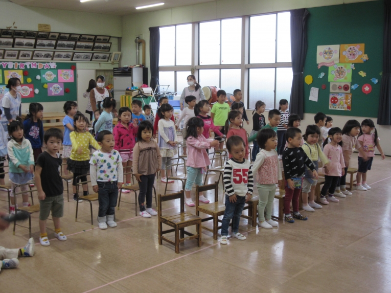 先月お休みしていたお友達も一緒に、みんなでお祝いします~ (#^.^#) 先ずは入場です! 元気いっぱいのお返事だねー!