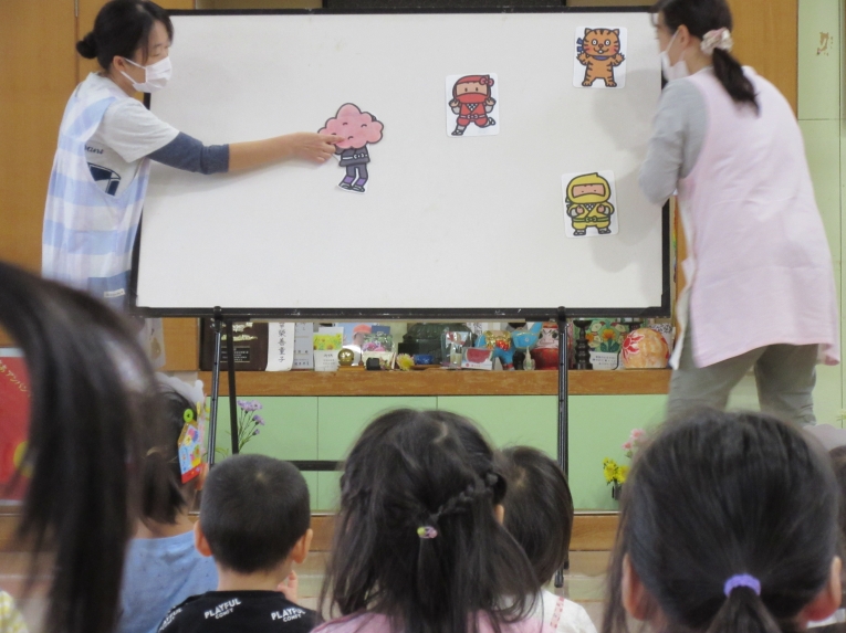それから先生からの出し物です。今日はパネルシアター 忍者が出てきていろいろなクイズ。そして最後に大きなケーキのプレゼント!みんなお誕生日おめでとうー!