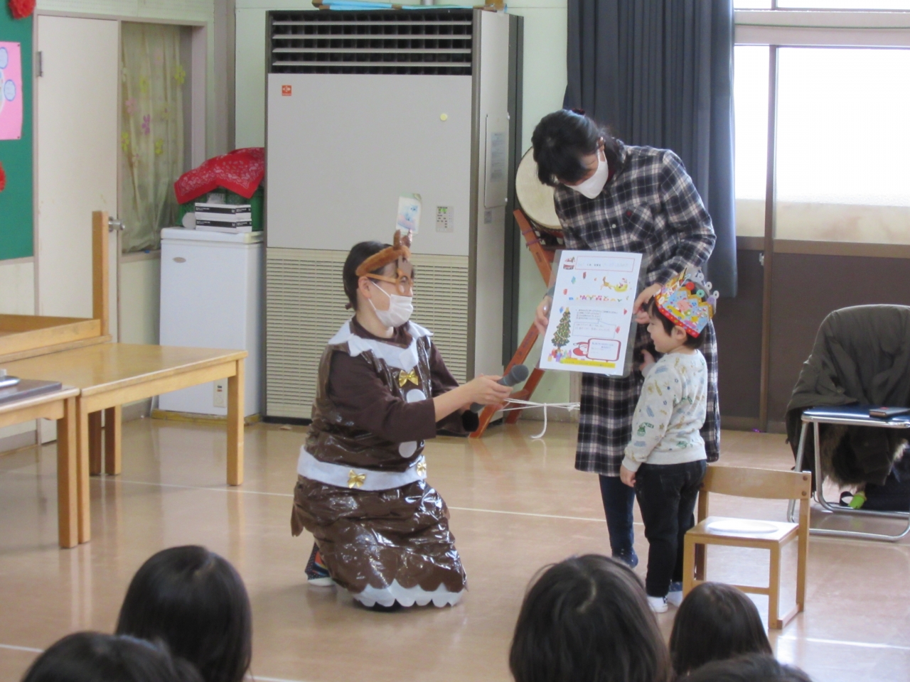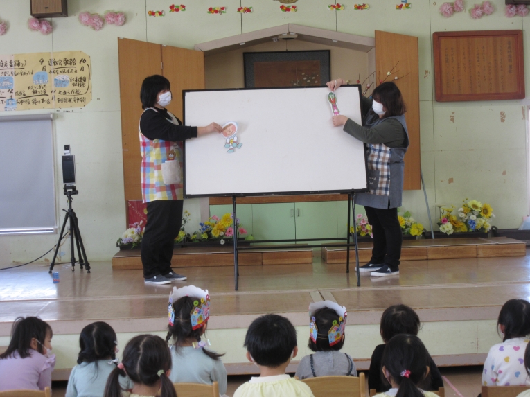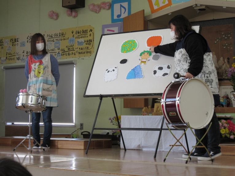 先生からの出し物では、「かみなりどんどこどん」のパネルシアターかくれんぼしているかみなりくんのお友だちをみつけたり、クイズをしたり、楽しかったね!!