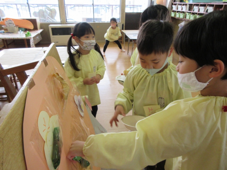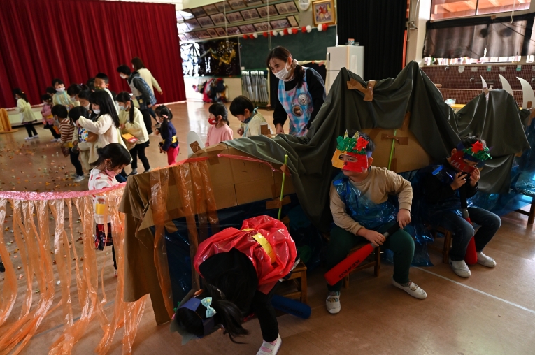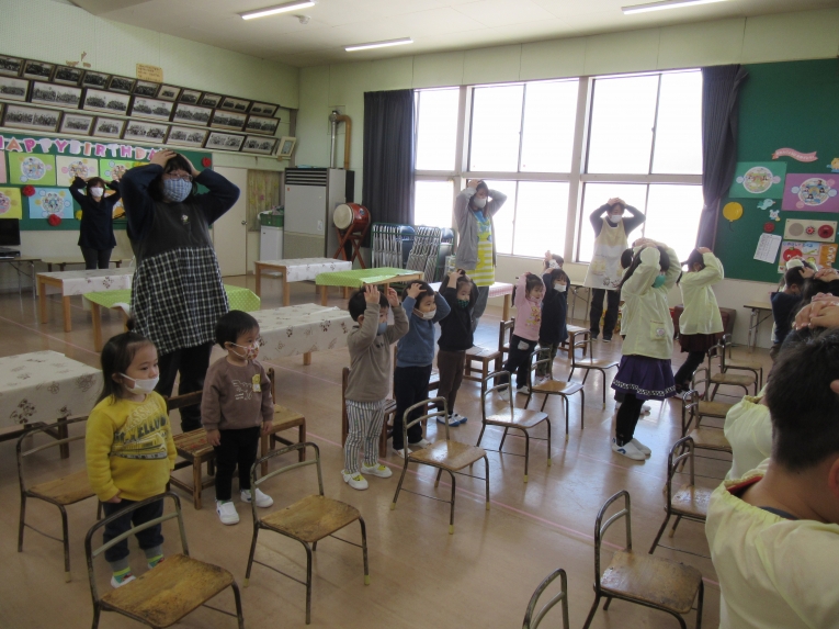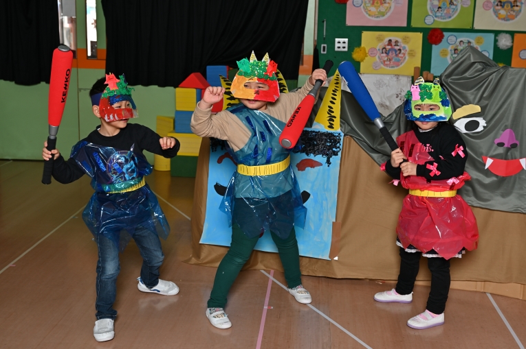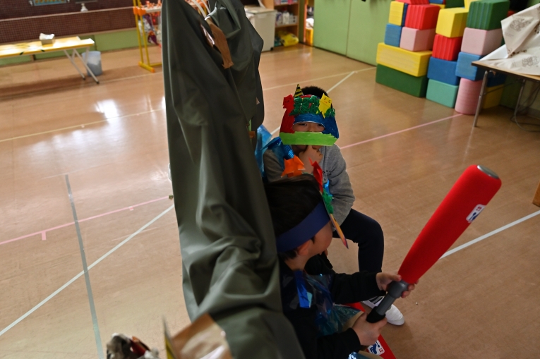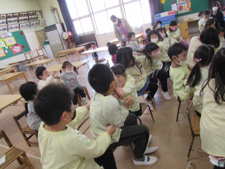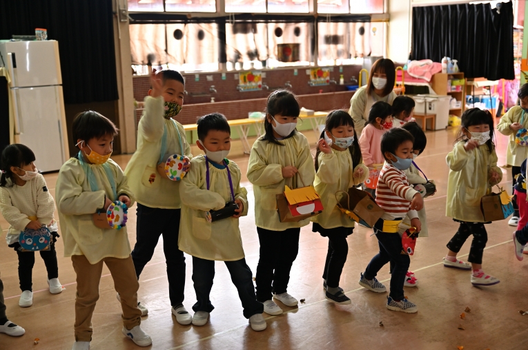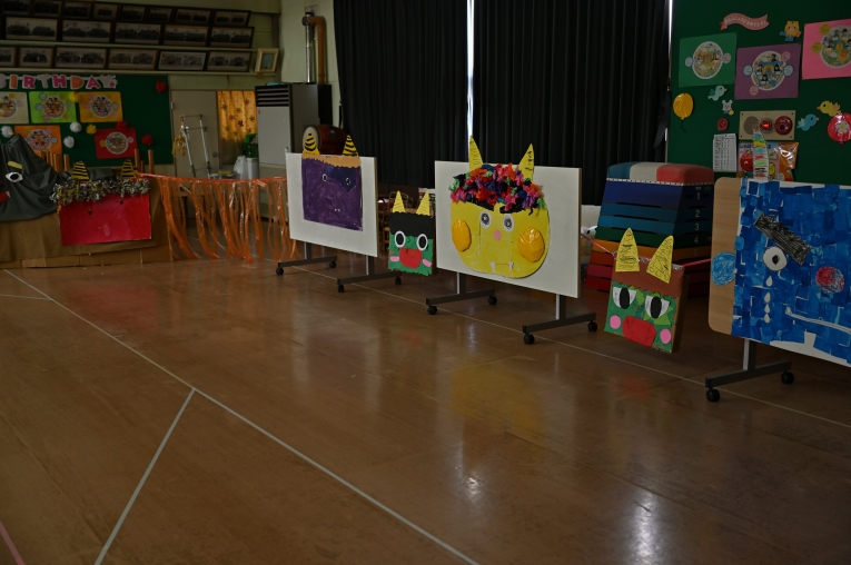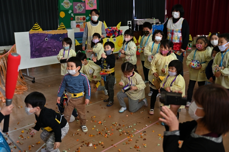 をそれぞれ作りました。今回はその鬼がずらりと勢ぞろい!!それらをめがけて、豆に見立て作った紙を小さく丸めたものをたくさん投げて鬼退治をしました。そして、密を避け、2回にわけていつも活動している縦割りのペアでにぎやかに「鬼は~外!福は~内!!」・・・きっと鬼たちも驚いて逃げていったことでしょう