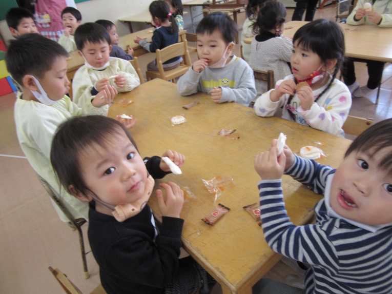 おたのしみのおやつタイム異年齢児一緒に お正月と雪をイメージしたお菓子で・・・