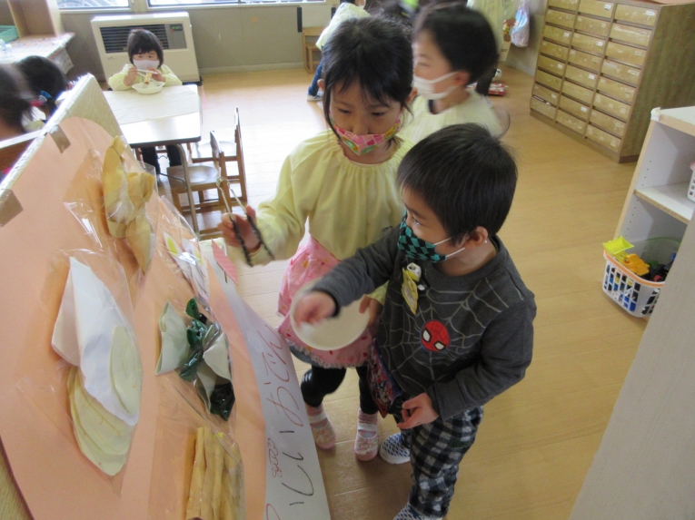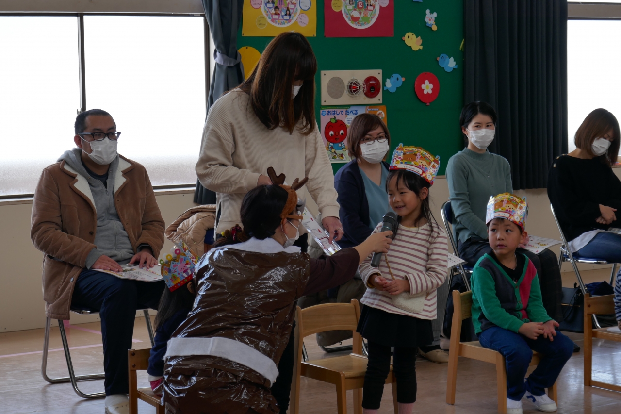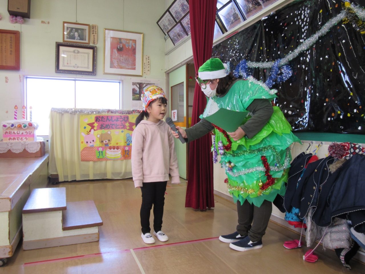 クリスマスにちなんで、「もしもサンタさんにあえたら?」という質問でした。一緒にじゃんけんがしたい、一緒にクッキーが食べたい、一緒におままごとがしたいなど、いろんな答えが出てきて、おもしろかったです皆は、どんなことがしたいかな??