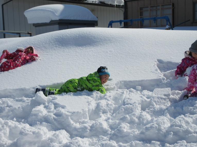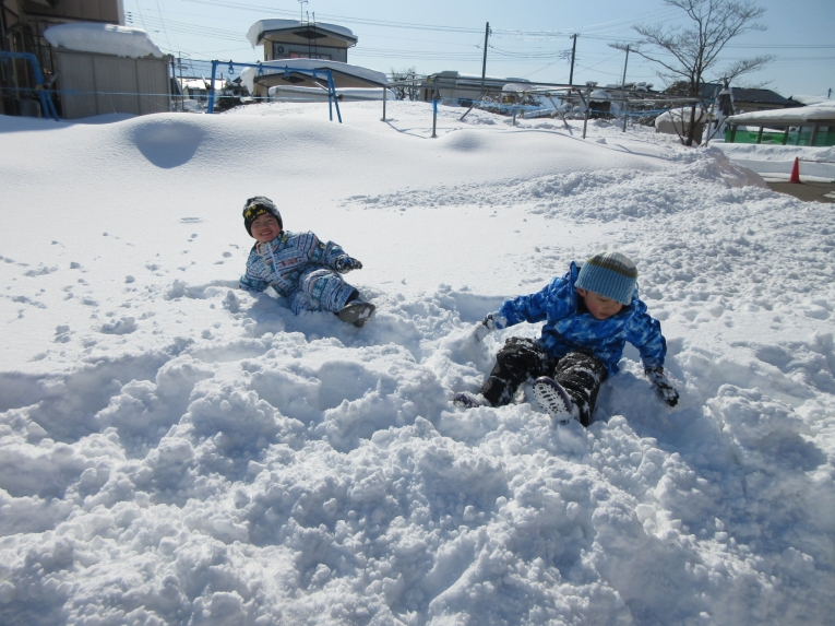 新雪のところに、倒れて空を見上げたり・・・大きい雪山にも負けず、どんどん登って行ったり・・・