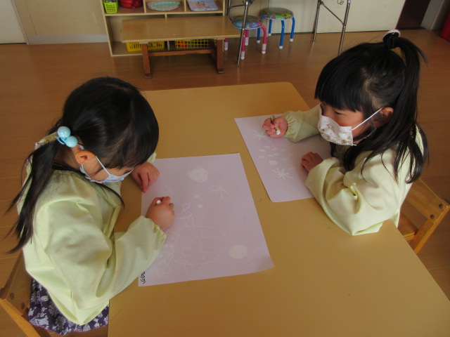 雪や雪だるま、ねこだるまも描いていいよ~ その後は絵の具ではじき絵にしてみたよ!