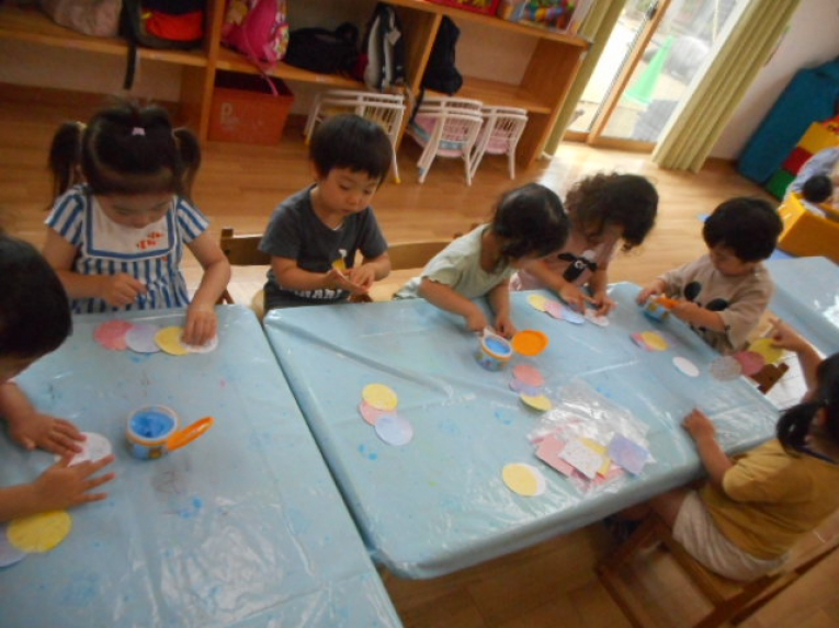 夜の空にしたい!それなら「星」だね!と折り紙で星作り。開くところが少し難しかったみたいです