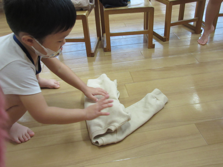 身体測定の様子です。自分で着替られるようになってきましたよ。自分の服は自分の場所へ…