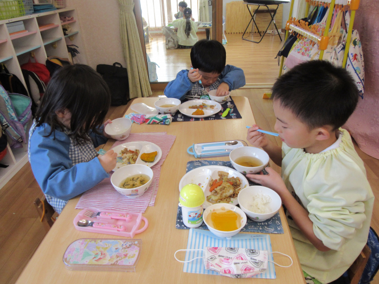 名前を呼んで席まで連れて行ってもらい、見守られながら真似て給食の準備です。おお!!🐣ちゃんもなかなか出来るじゃない