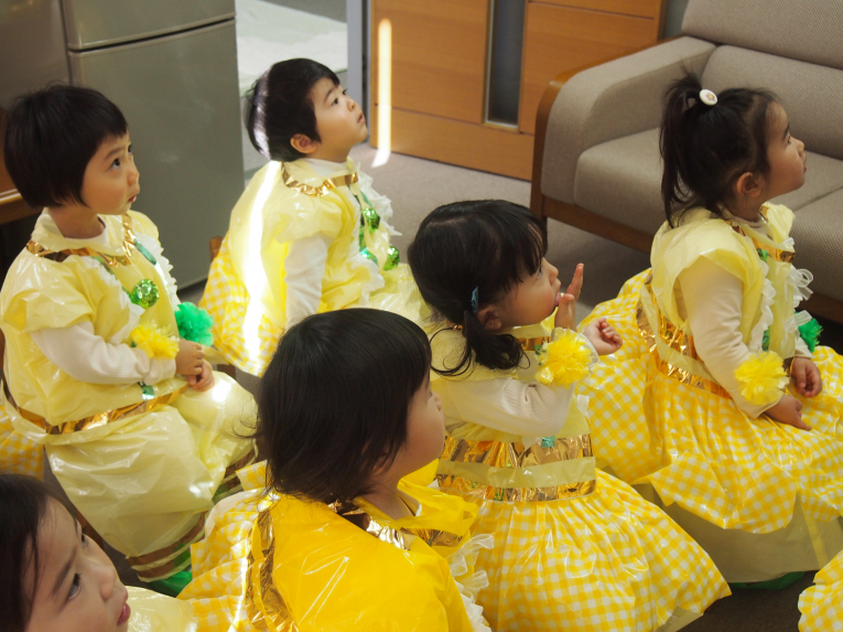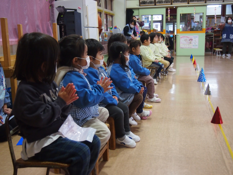年長さんのオペレッタを見ている様子です。みんな集中すごーい!!と手をたたいてびっくりしています。