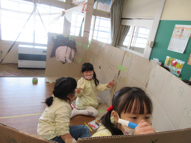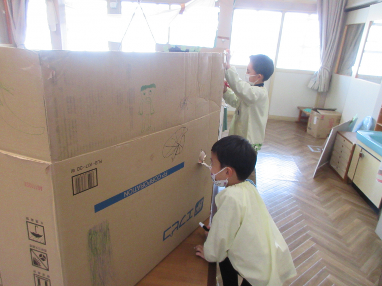 大きな段ボールをつなげて、「おばけやしき」製作中