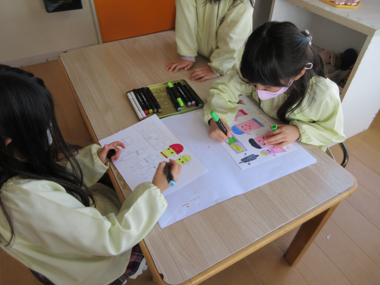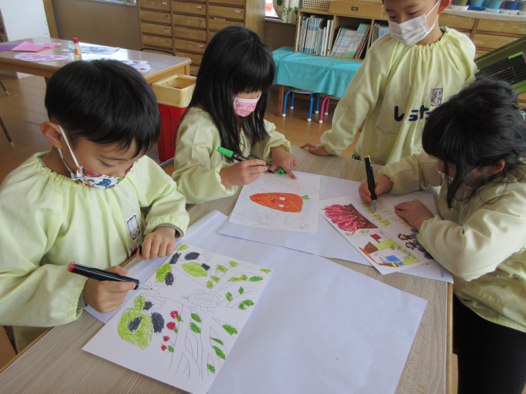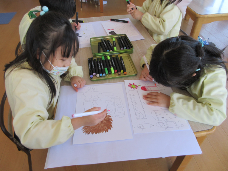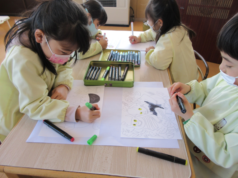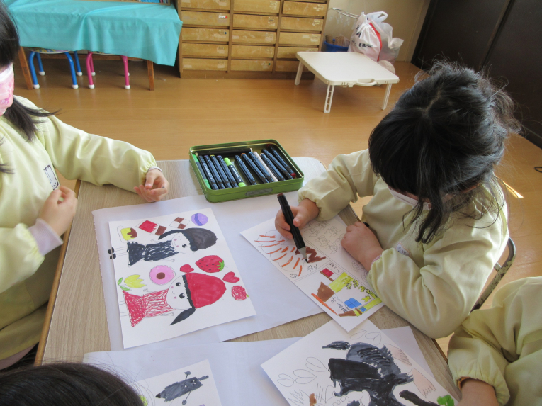 卒園記念の製作もしました!絵本が大好きなゆき組さんは、自分のお気に入り絵本の絵を描きました本物のイラストレーターや漫画家さんが使うと言われているペン(ダイ〇ーにあります)で書きました