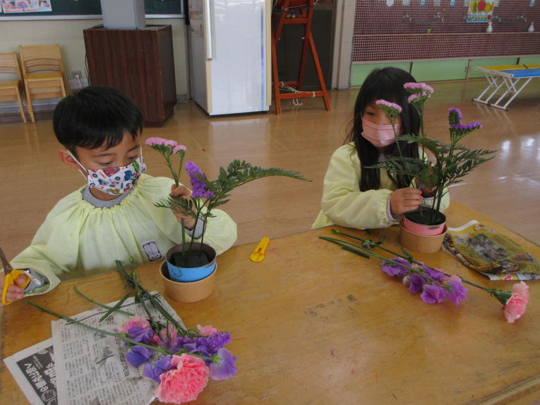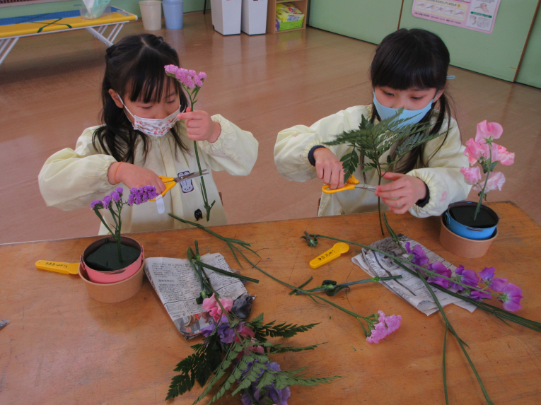ゆき組最後のお楽しみは 園長先生との「アレンジフラワー」