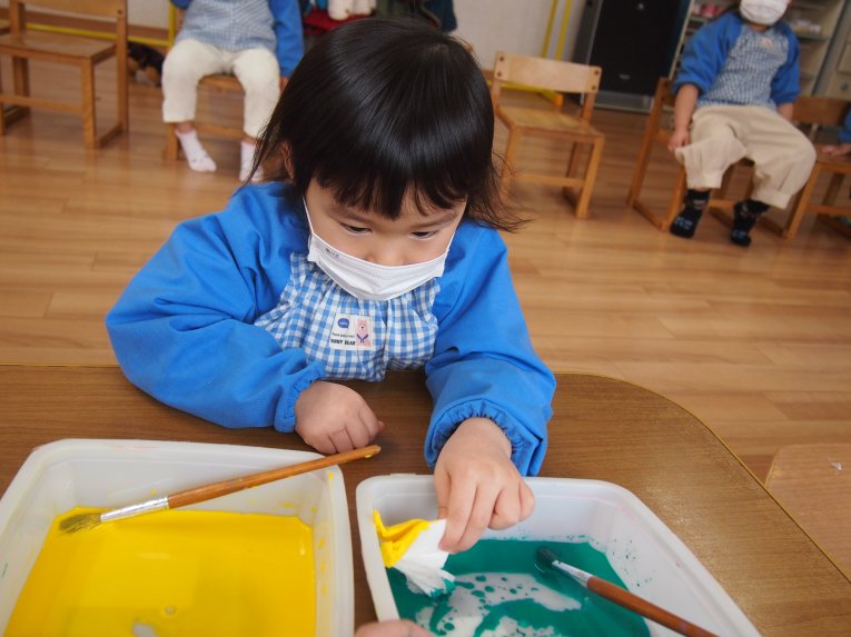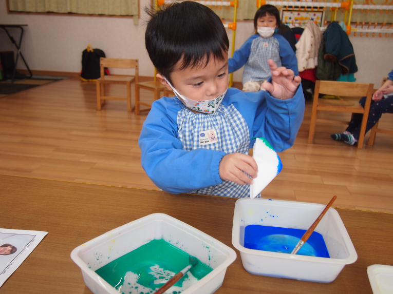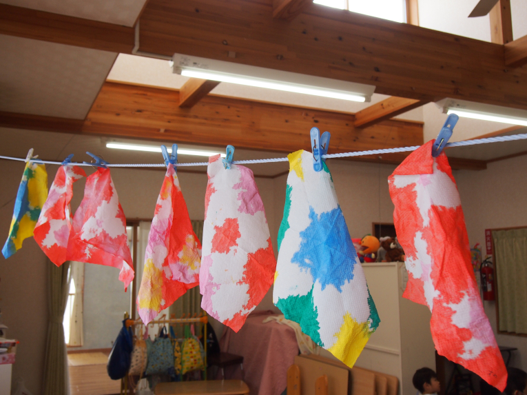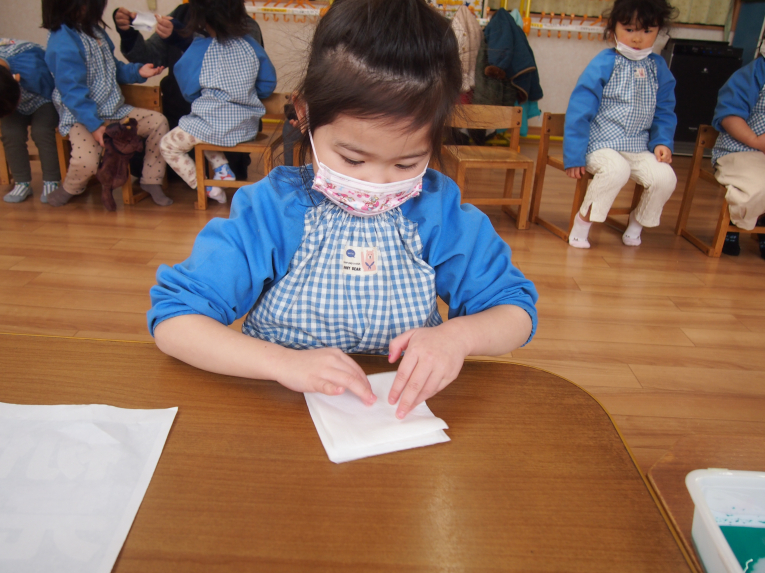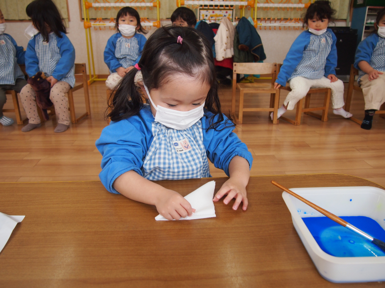 折り方もアイロンがけも上手になったね~ 絵の具をチョンチョンとつけてじわ~じわ~とにじませます