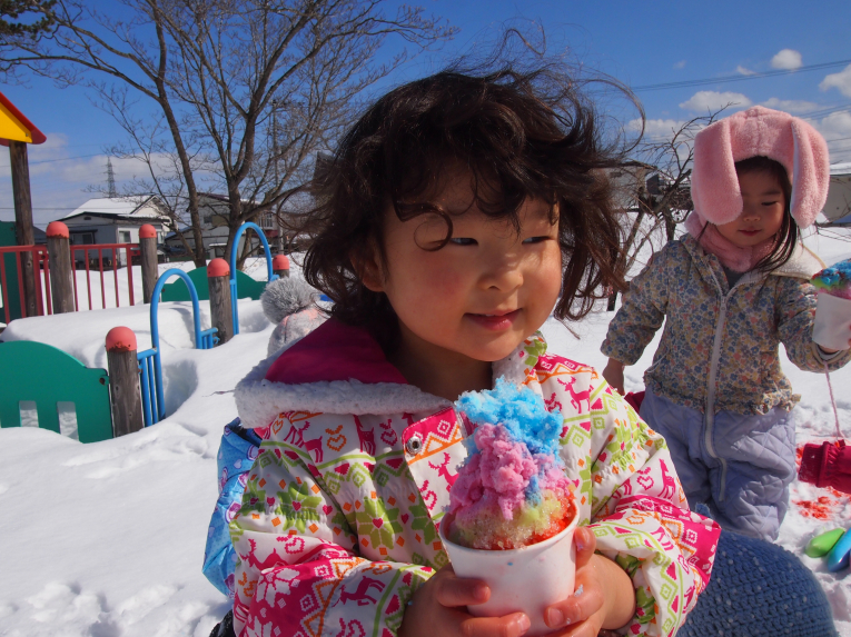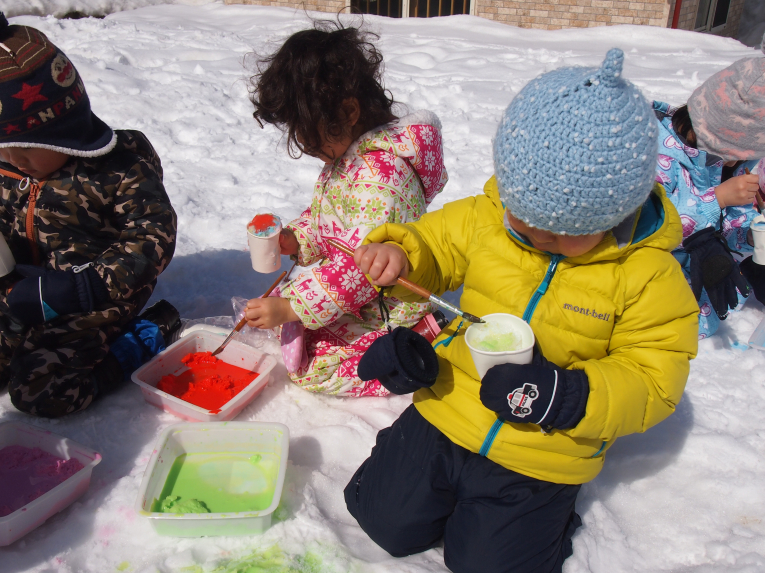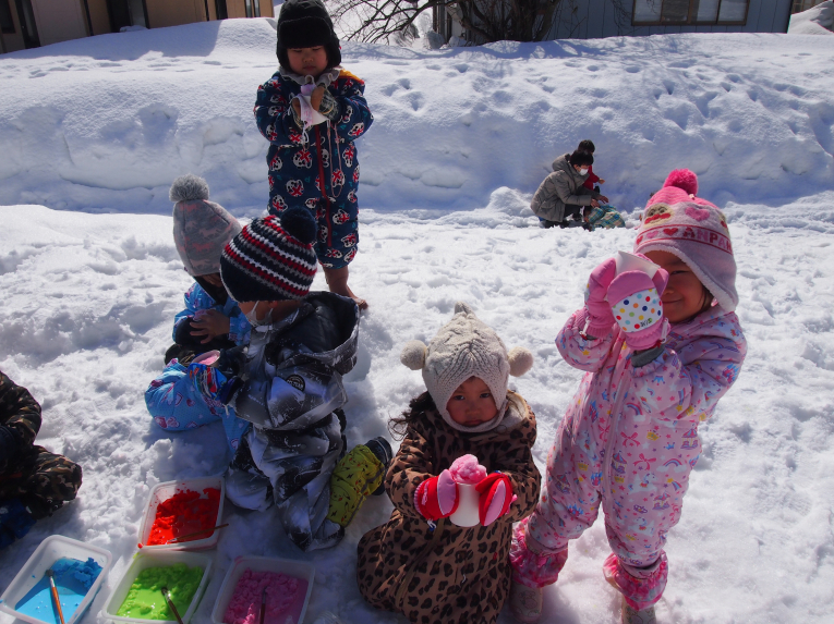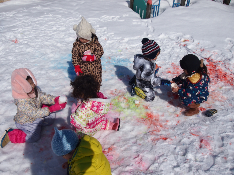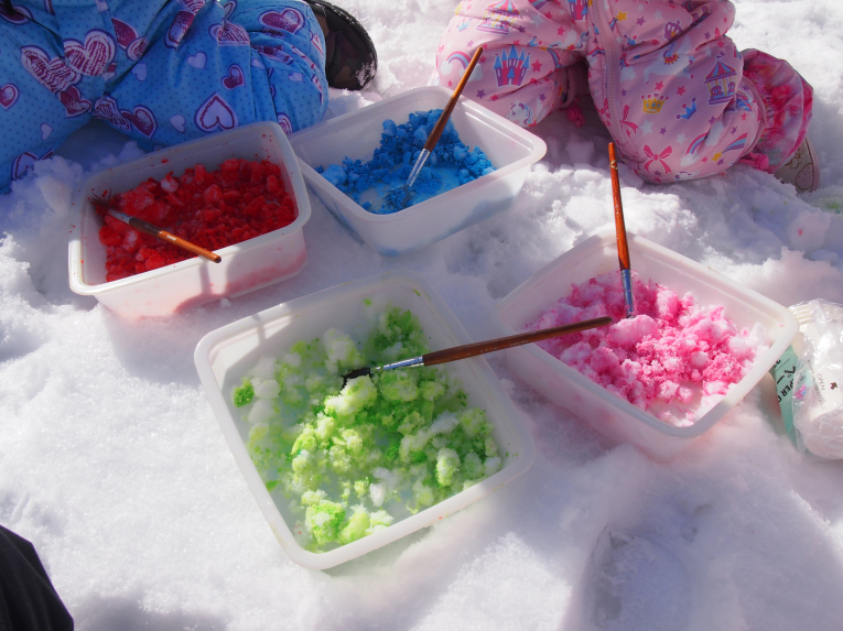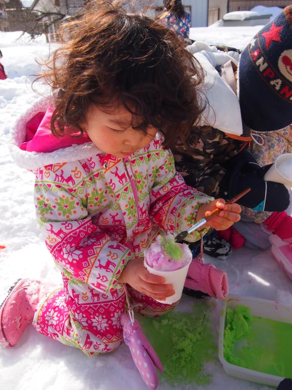 絵の具を雪に混ぜてシャーベットのできあがりー!!