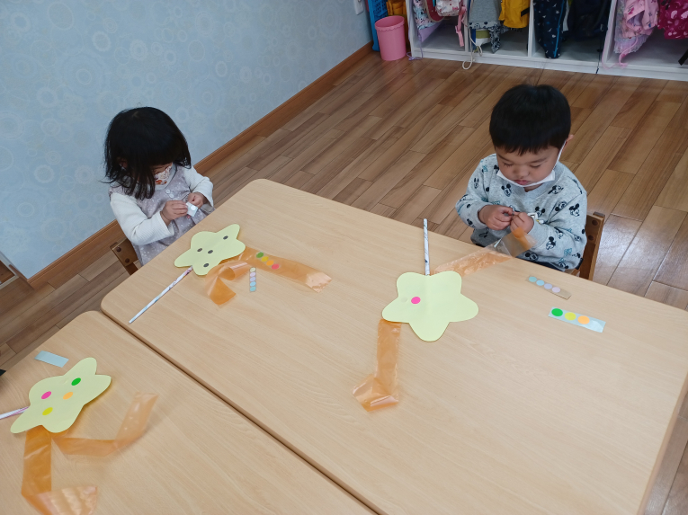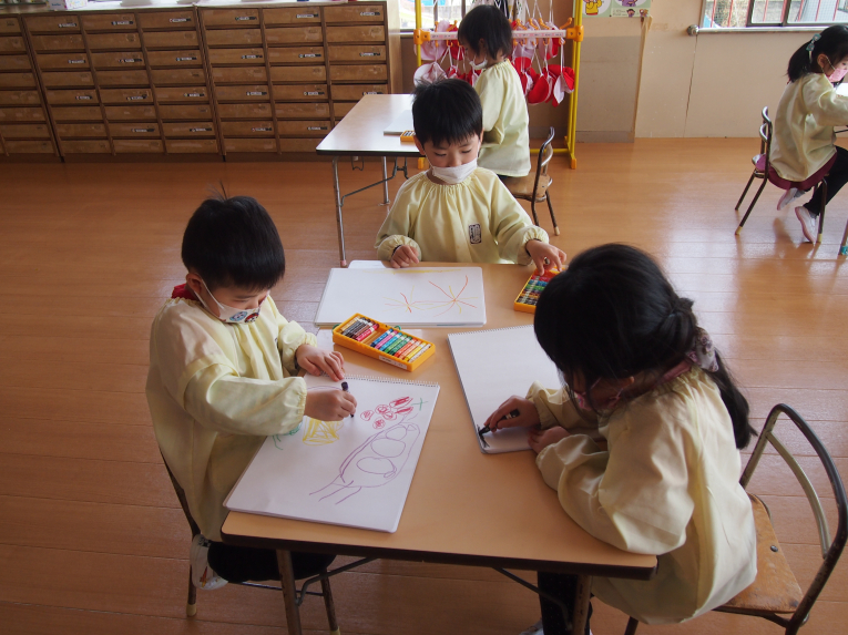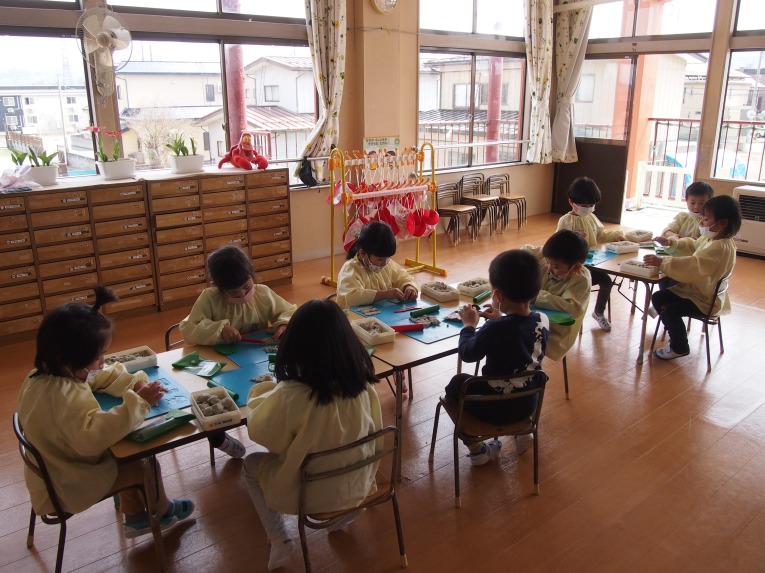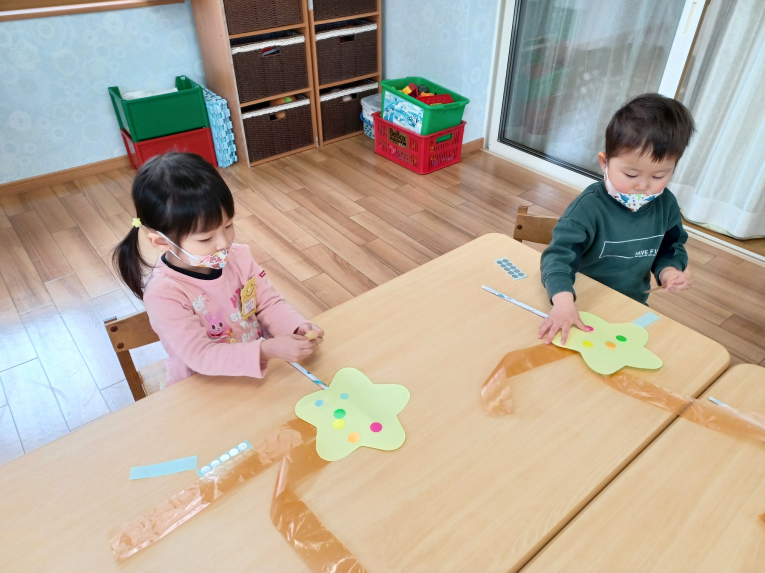 この日は、みんなで赤と黄色の中から好きな色を選んでチューリップ作り🌷をしたね。