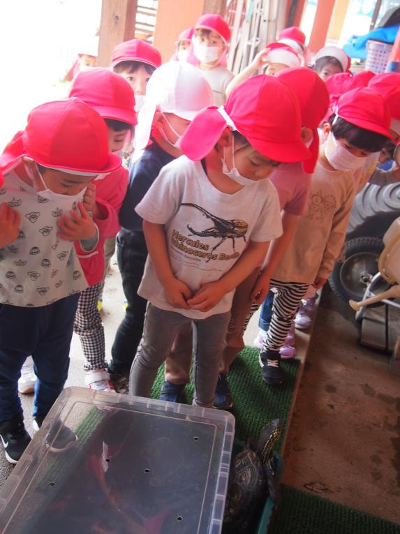 幼稚園にいる大きいカメさんを見てびっくりの子どもたち