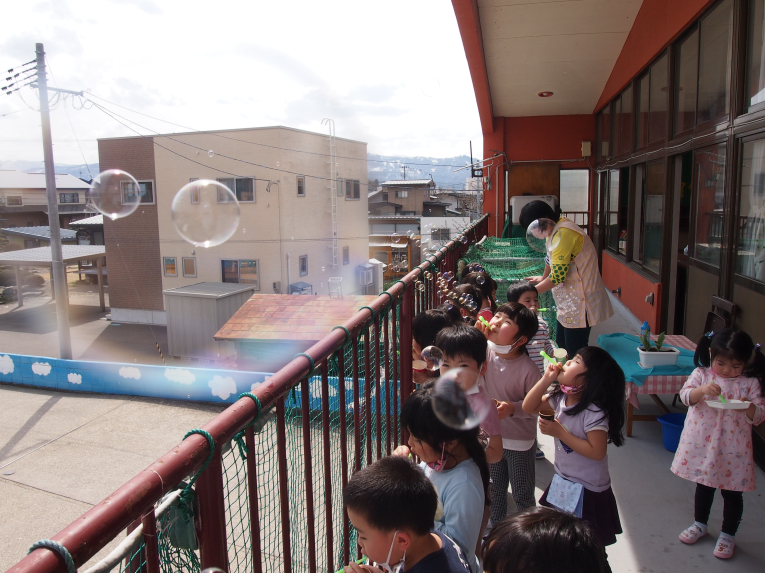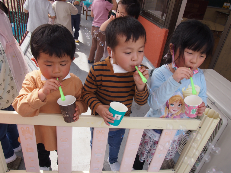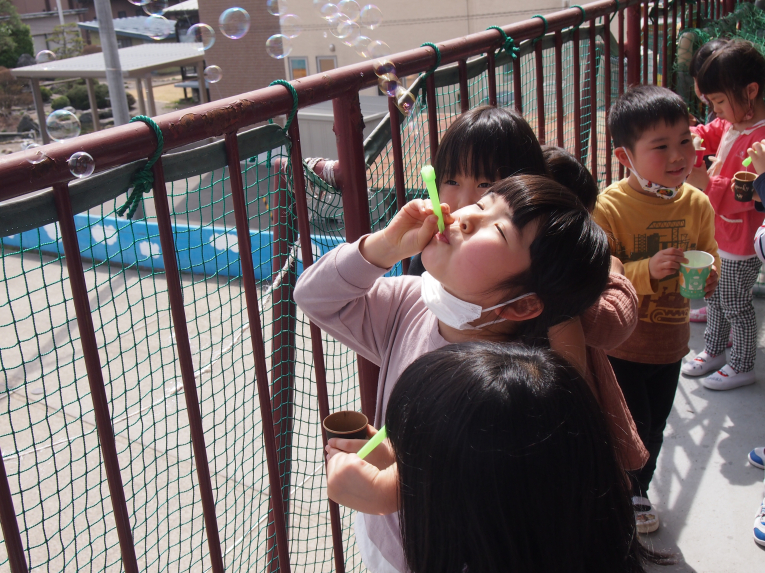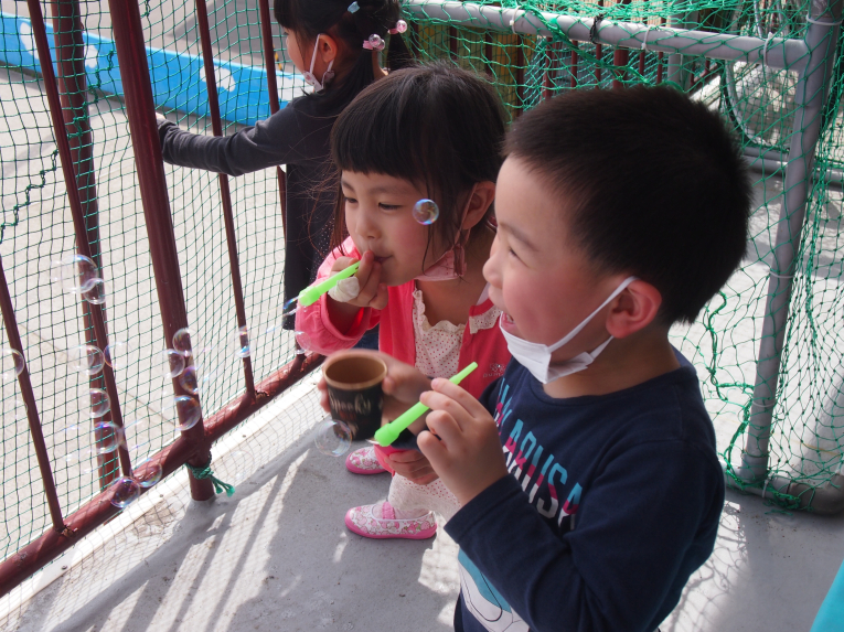 午後のちょっとした時間に、シャボン玉をしました。子供たちのいい笑顔が沢山です