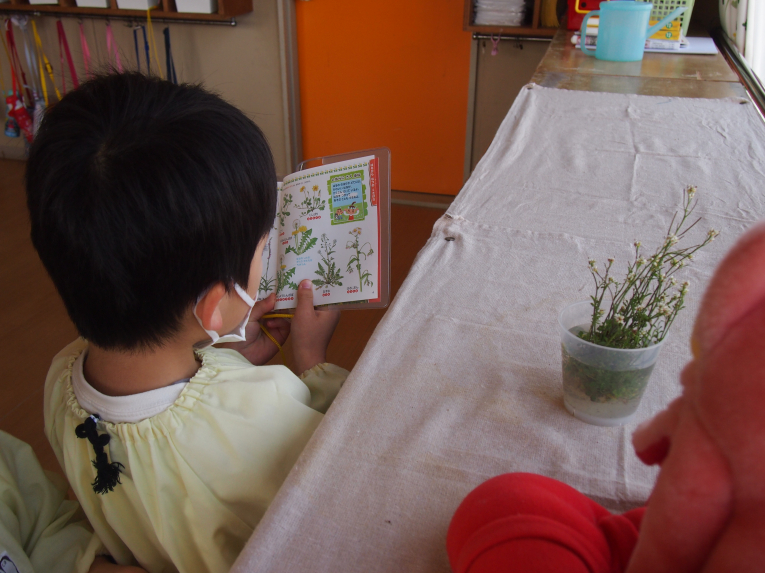 これは幼稚園の園庭にあった草花なんだろうね~??? 早速、「たねつけばな」「なずな」だと発見しました!!