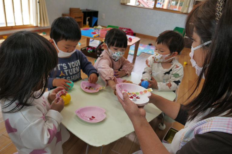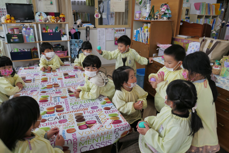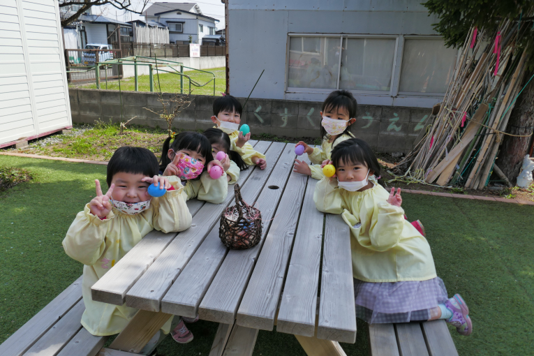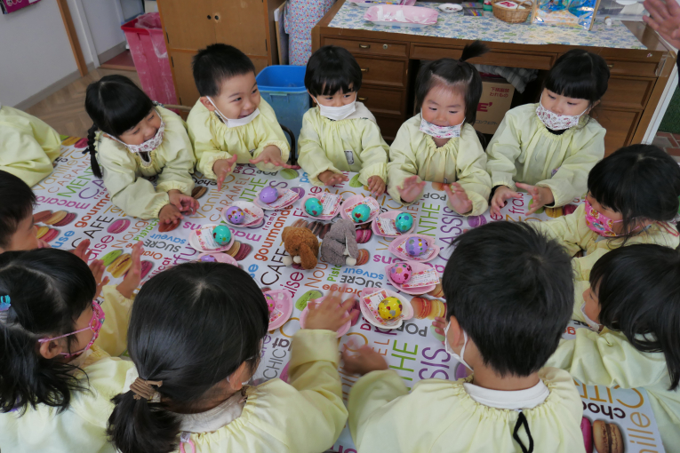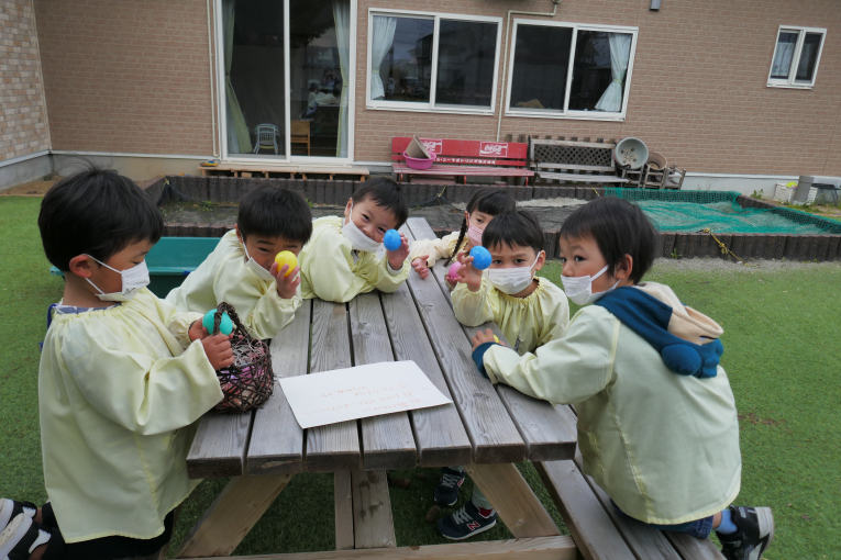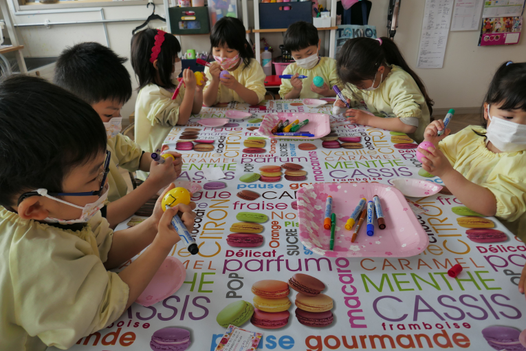 ゆきぐみさんのたまごは、幼稚園のあちらこちらに散りばめられたカードをヒントに無事みつけました!さあ、今度は卵に魔法がかかるようにきれいに飾り付けだよ