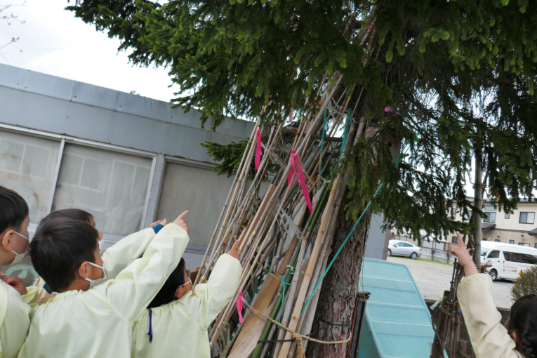 え?え?え? 木の上? なんとことりさんの巣箱のうえに乗っかっていました!(幼稚園には巣箱があっったこと知ってたの?)「どうしてあんなとこにあったんだろ?」「宇宙から落ちてきた途中でひっかかったんだよ?」「すごーく高ーく跳べるウサギさんがぴょーんって跳んだんだよ」 綺麗に飾り付けをしながらおしゃべりに花が咲いていました