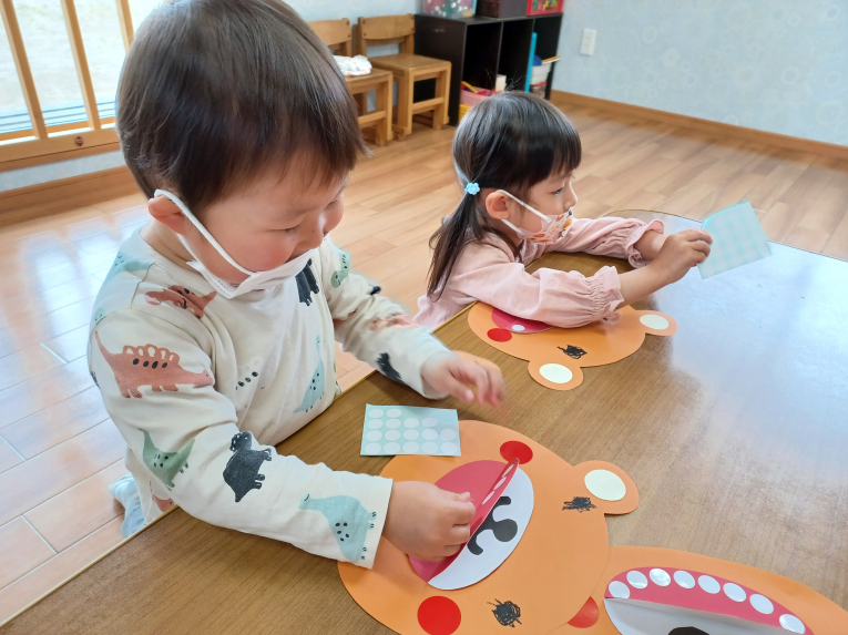 朝の会では、「はをみがきましょう」の歌に合わせて、指の歯みがきににして、シュッシュッさせて楽しんでいました