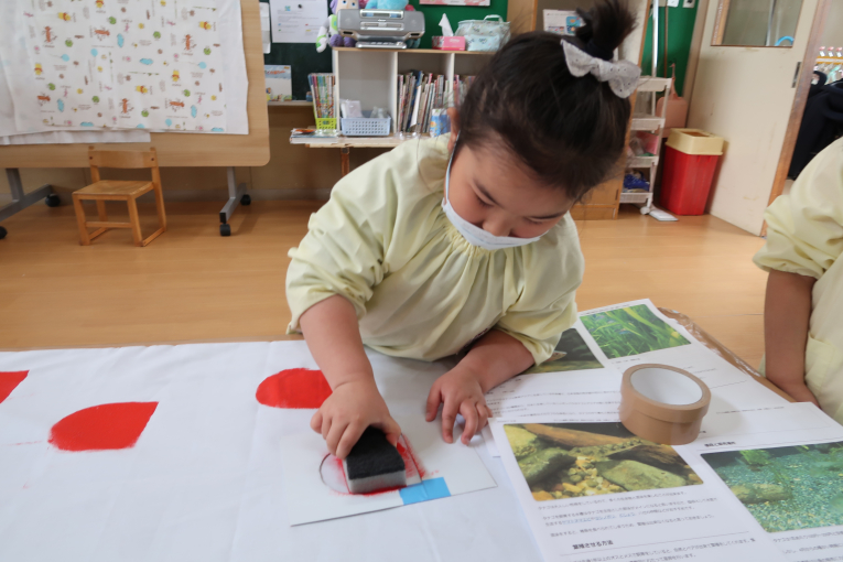 絵の具のステンシル。型紙を押さえながらスポンジを押し付け絵の具で色付けしていきます。これがなかなか難しく…ずれると形にならないんですよね 何を作っているかというと。。。!!