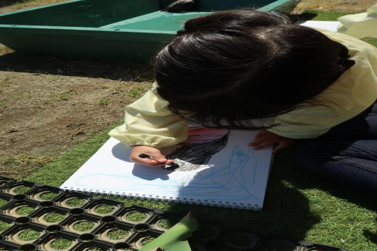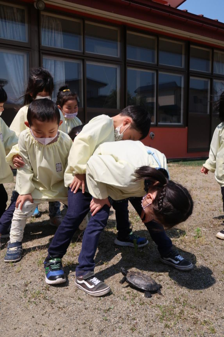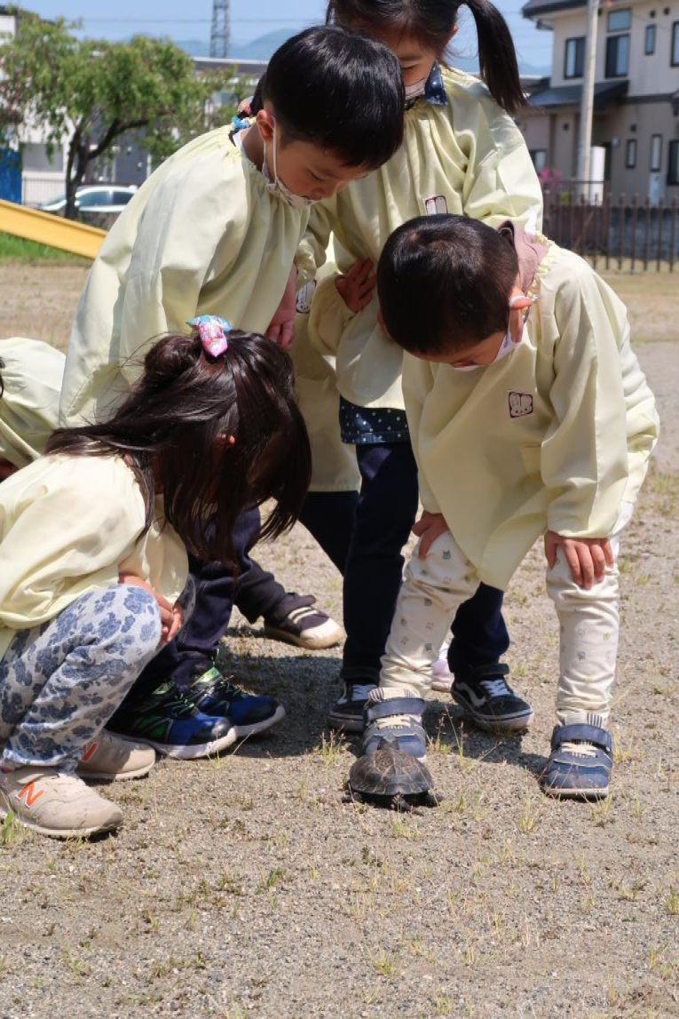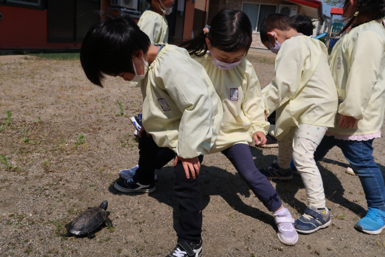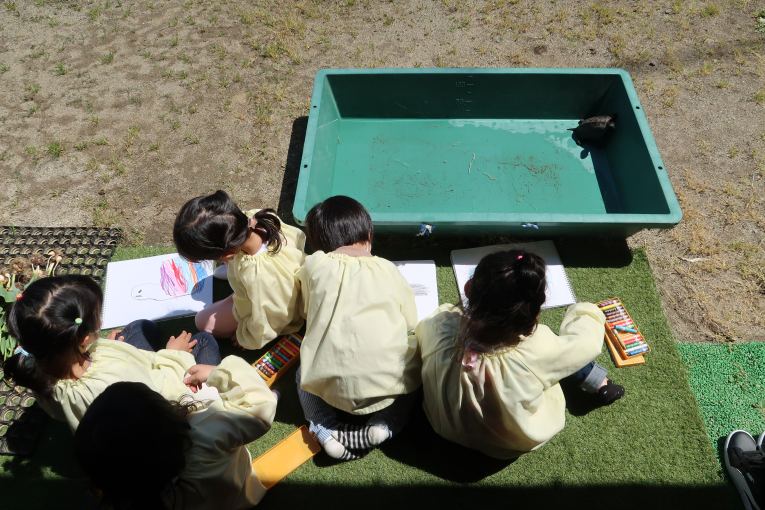 給食後、外で日光浴をさせていますが、うめ組のテラス前に連れてくると、みんなでカメの絵を描き始めました
