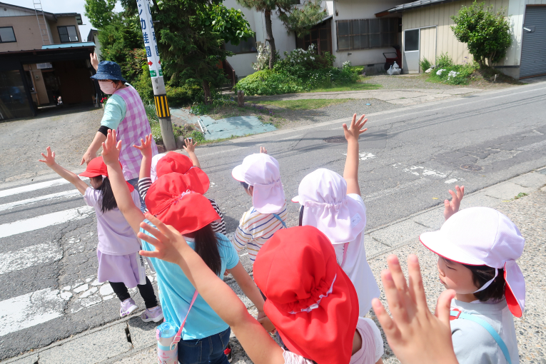 幼稚園前の横断歩道も手をあげて渡ります!!「キョロキョロ」止まってくれる優しいくるまの方に