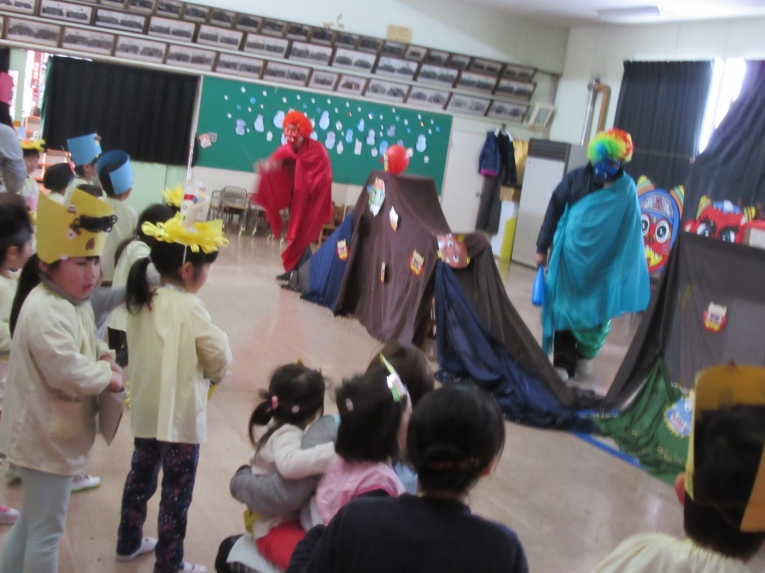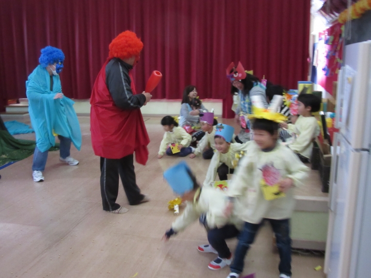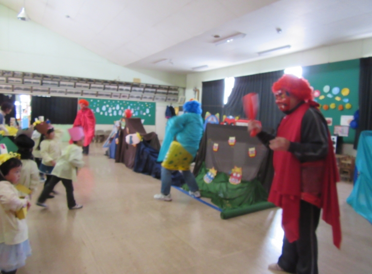 おそるおそる鬼が島に行くと・・・あ~!!いたいた!こ・・こわい・・・・(・_・;) でもでも負けないで みんなで「鬼は~外!!」みんなで必死で豆を投げつけて、鬼もびっくり!「あーー!!マイッタマイッタ~!!」って逃げて行った!やった!ばんざーい!!