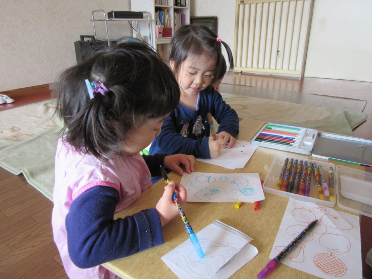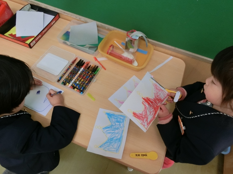 先週持ち帰った鬼のお面や豆入れ、いかがでしたか?「あおおににする!」「かっこいいかお~!」などと張り切って作っていました
