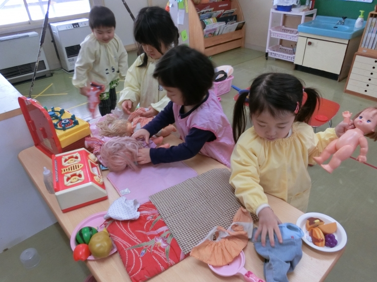 おままごとでは、小さいお人形のお母さんになりきってお世話をしたりペットの猫になりきったり…