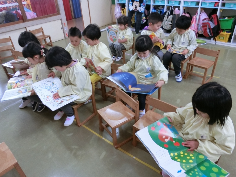 お集まりにみんなが集まるまでは好きな絵本を読んで待っていますお当番ではかっこよくおやつくばり