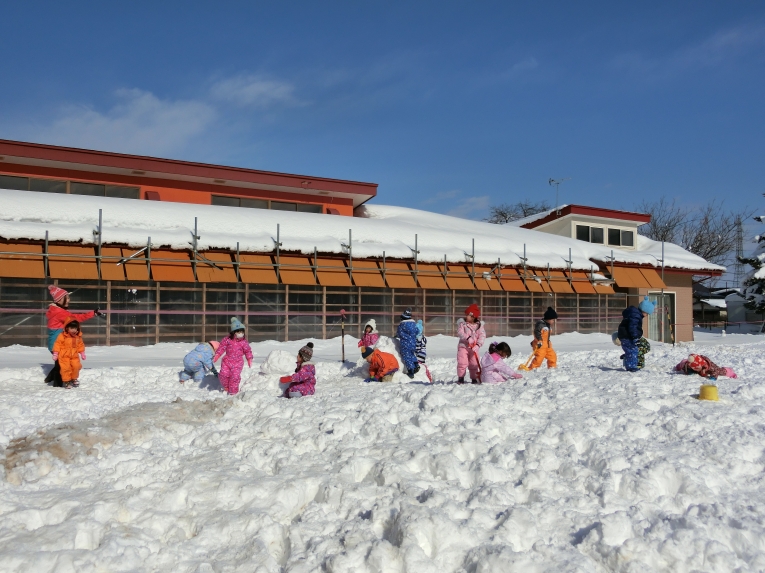 例年に比べ、雪が少ないので雪山もなく、そり滑りなどは出来ないのですが、雪だるまを作ったり、かまくらを作ったり、楽しんでいます