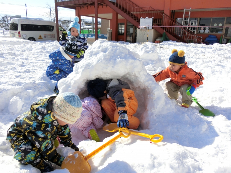 天気がいい日の雪あそびは、のびのびワイワイ楽しさ全開です年中さんの作ったかまくらに興味津々