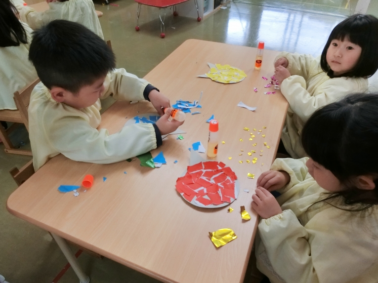 折り紙を破ってパズルのように型紙を埋めていくのに真剣な様子