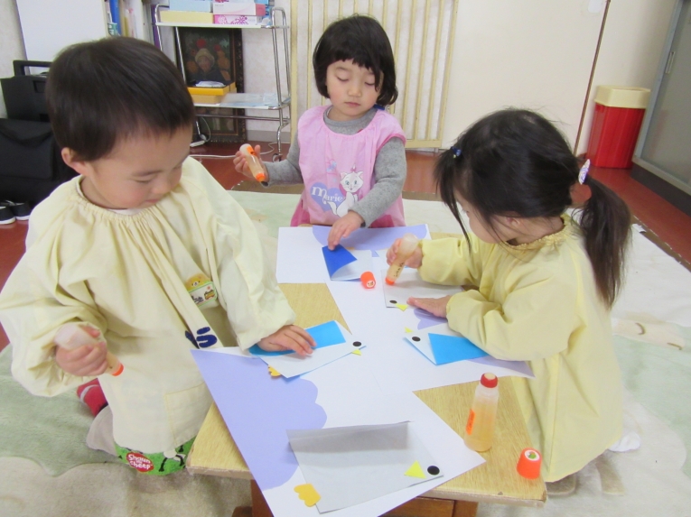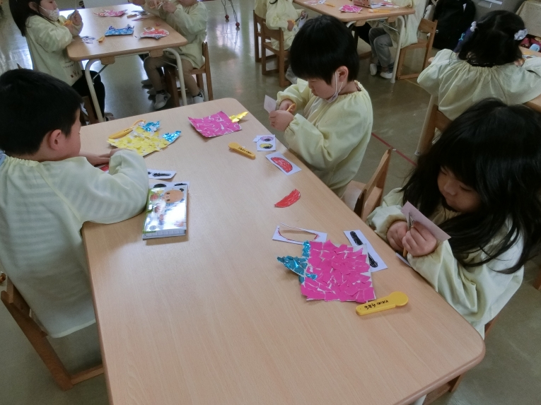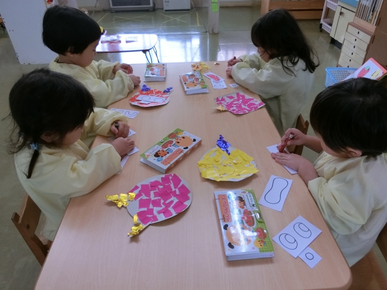 ゆき組は「福笑い鬼」という製作カードがあって、みんなで作ってみました