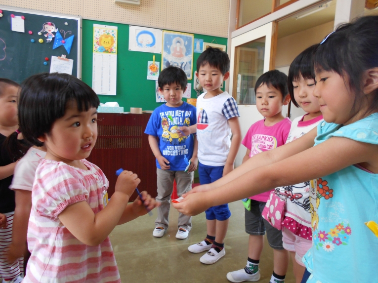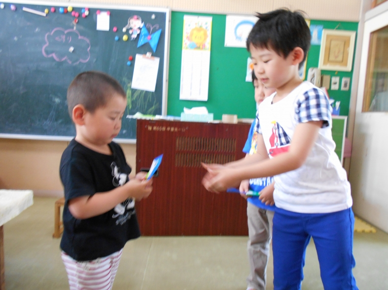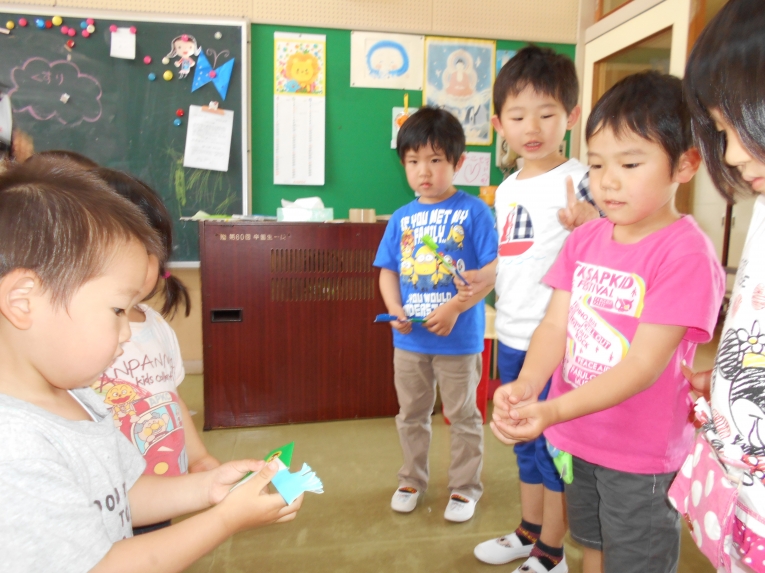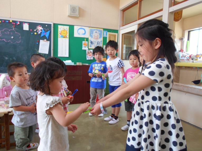 年長組さんが折り紙で折った歯ブラシとコップをプレゼントしてくれました。