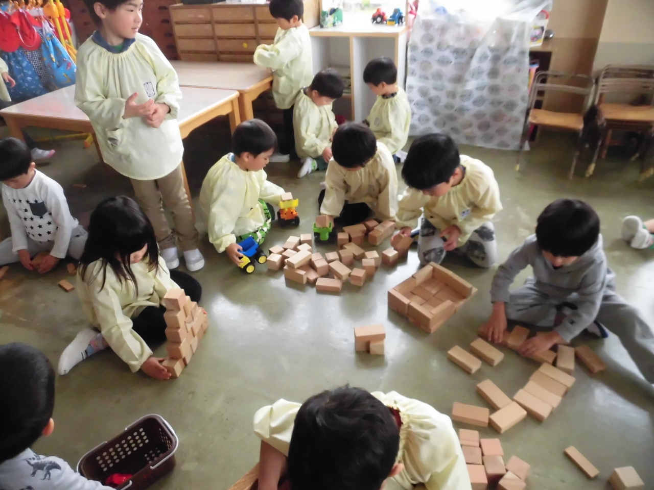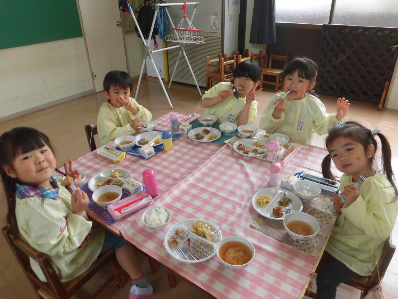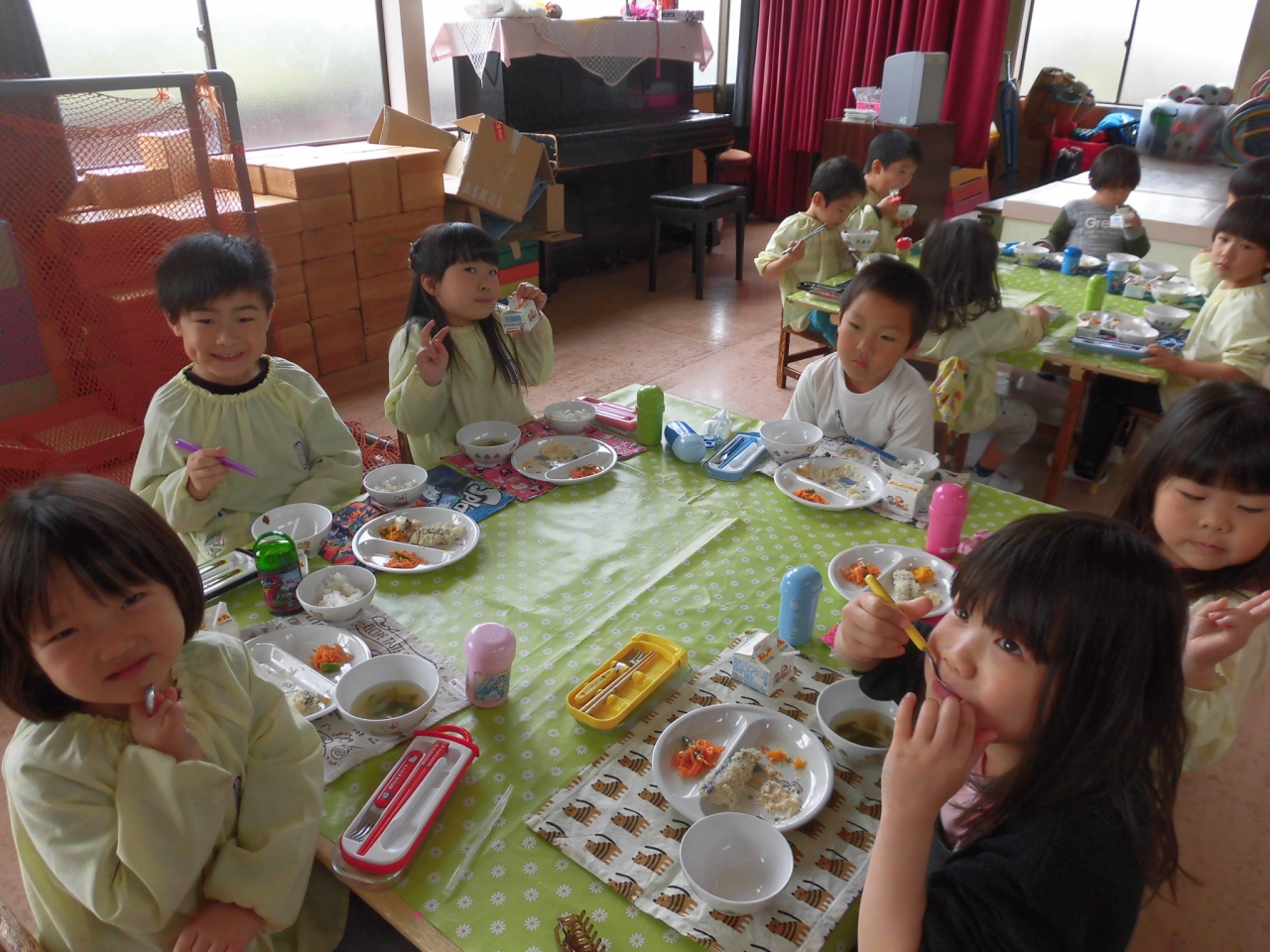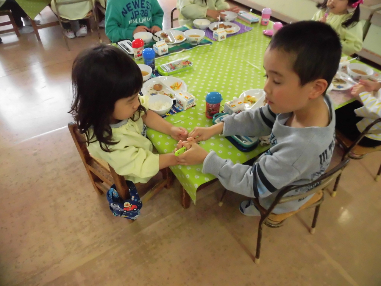 ドキドキわくわくした表情のこども達も一緒に給食を食べているうちに、会話も弾み楽しそうでした。ゆき組さんは1つ年下のうめ組さんのお世話もしていましたよ。食後の自由あそびもとても賑やかでした