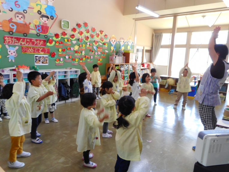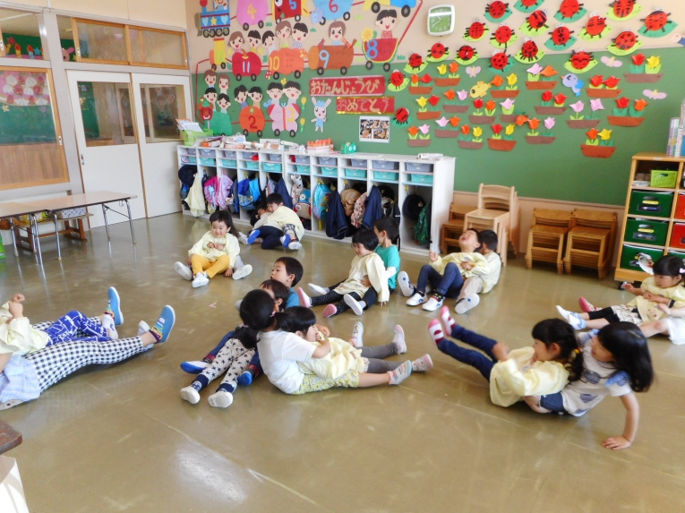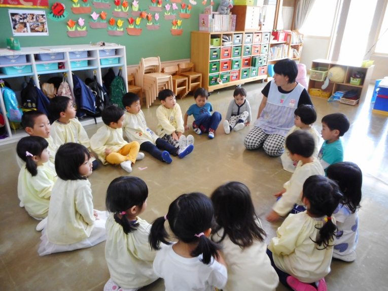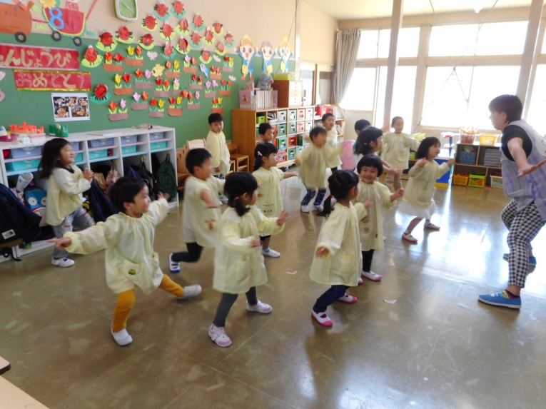 次は、ひよこ、ほし、うめ組の「なかよしタイム」、一緒におやつを食べてふれあい遊びをしました。