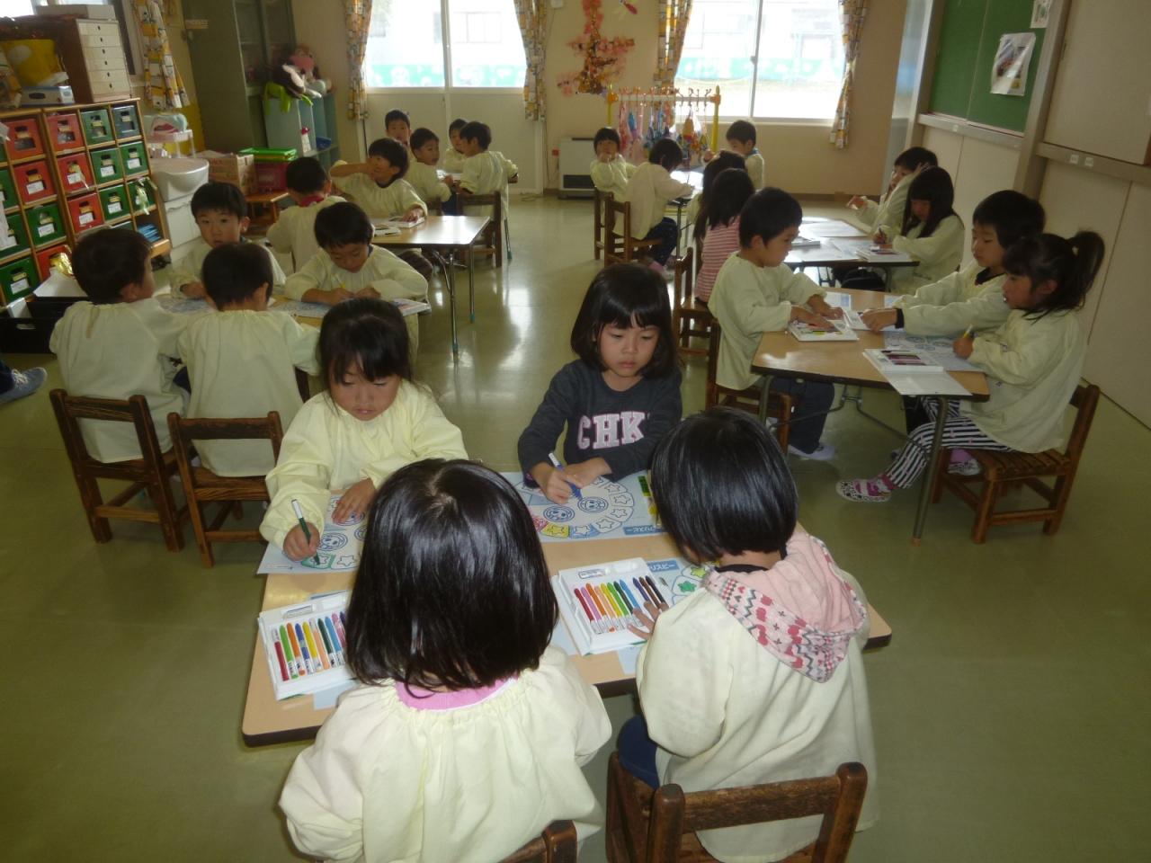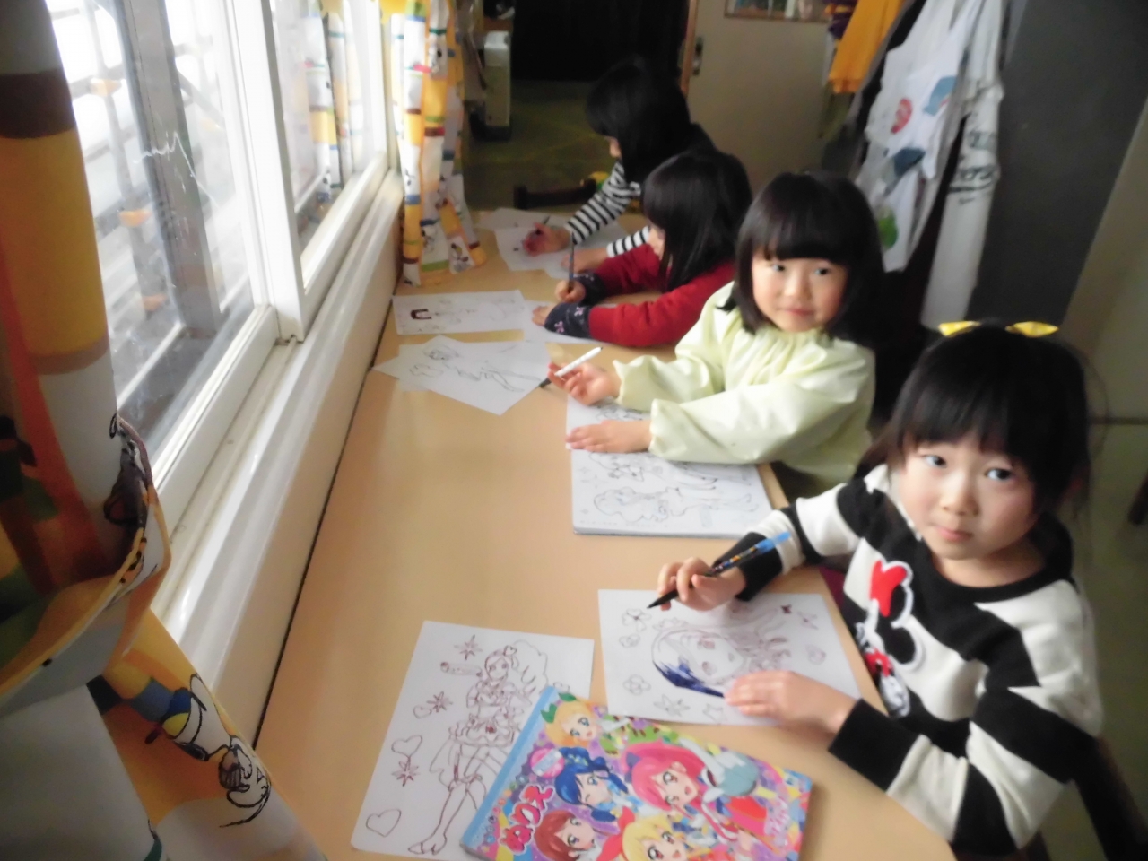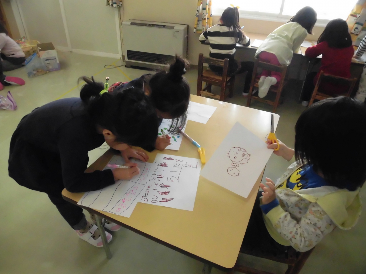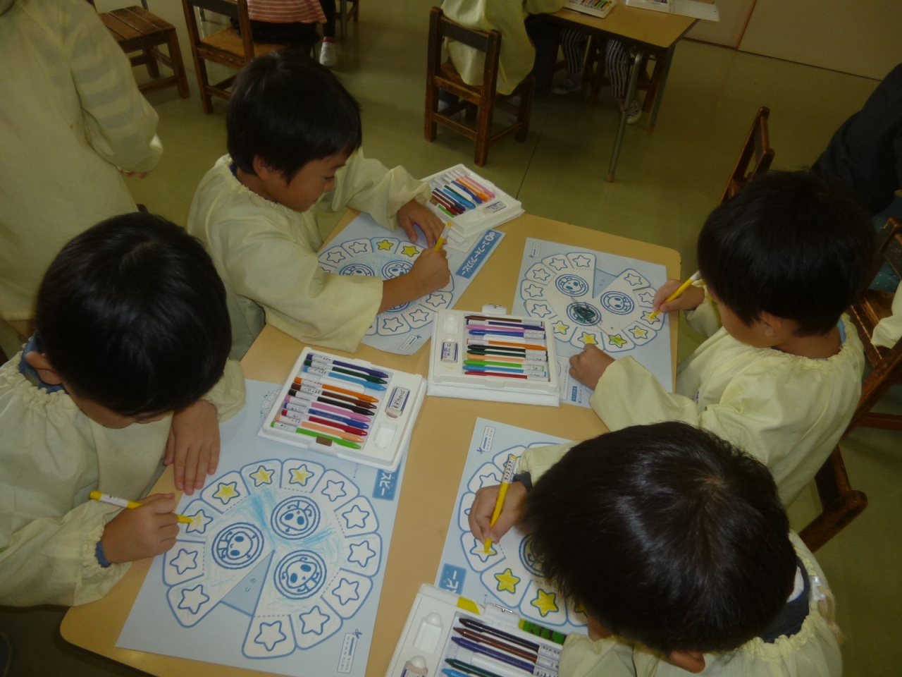 久しぶりのお部屋の様子です(^・^) 今日は、製作カードにチャレンジしました。これは何?・・UFO?宇宙人がいるね~ ほんとだ!可愛い♡ え?怖いよ~ みんなおしゃべりしながらワイワイクーピーペンシルを動かしていました。