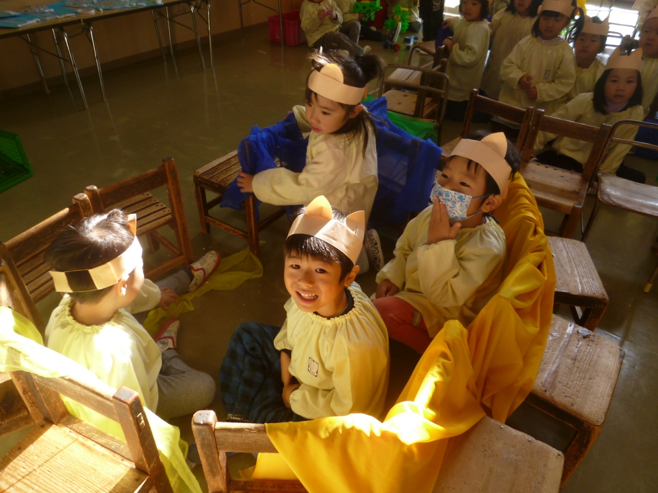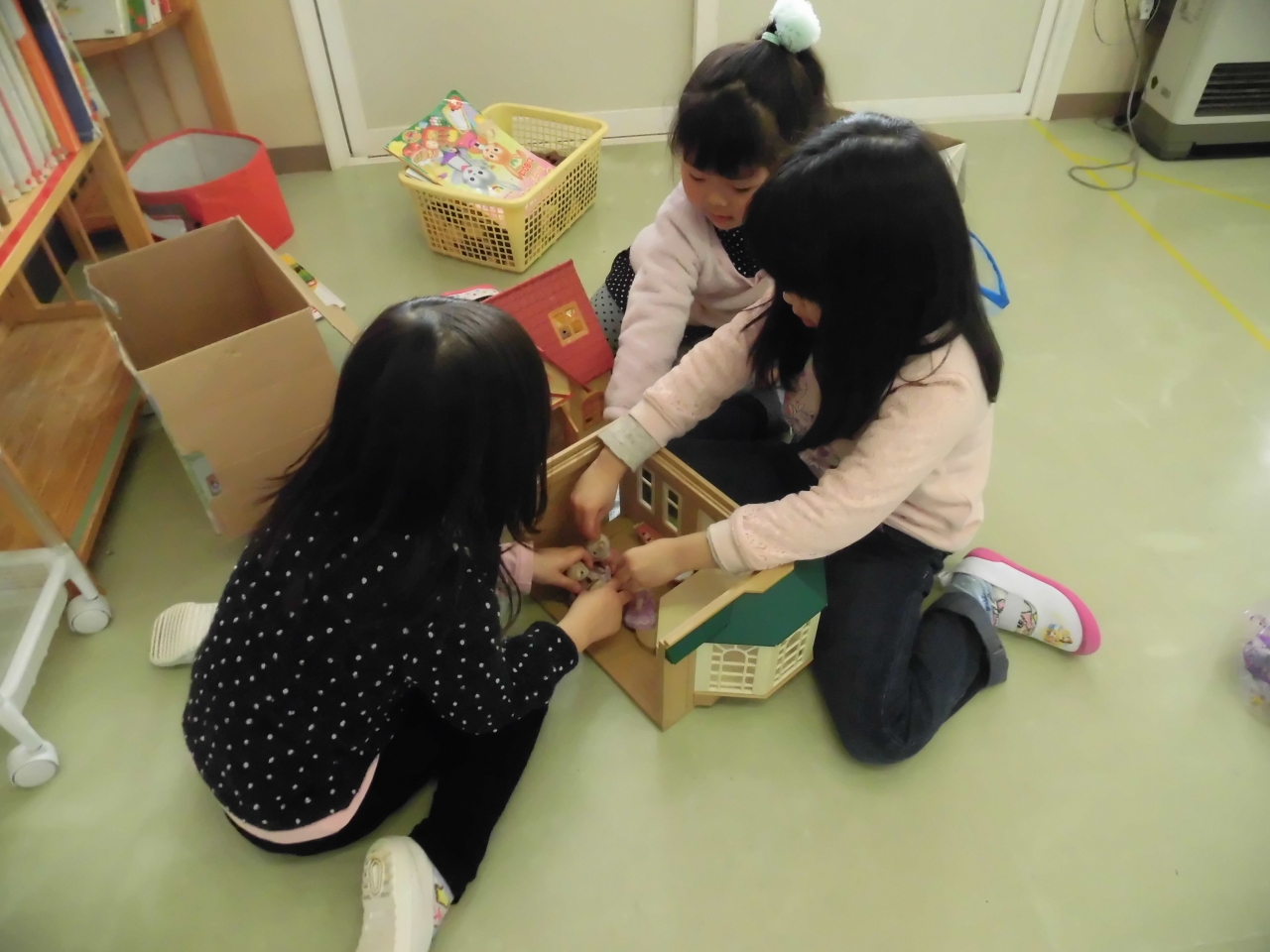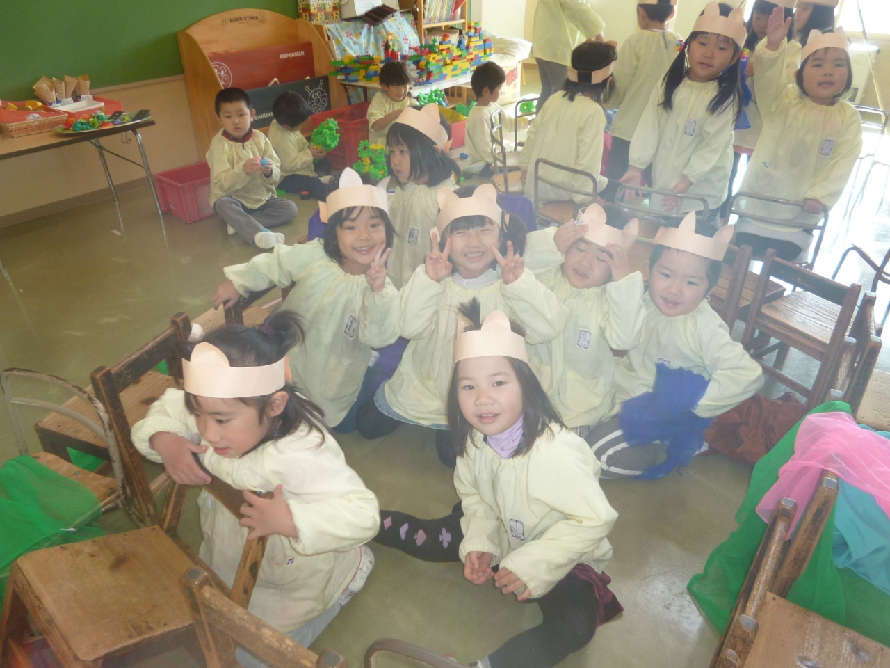 絵本から始まった劇遊び・・ ランチ後の午後の時間、子ども達はせっせとお家を作り出しました。あらら・・?もしかしたら・・?と思って見ると「3匹のこぶた」ごっこ(^・^) 「わたしおおかみ~!」と怖~い(可愛い?)オオカミに変身して、そっとコブタのお家へ行きます。
