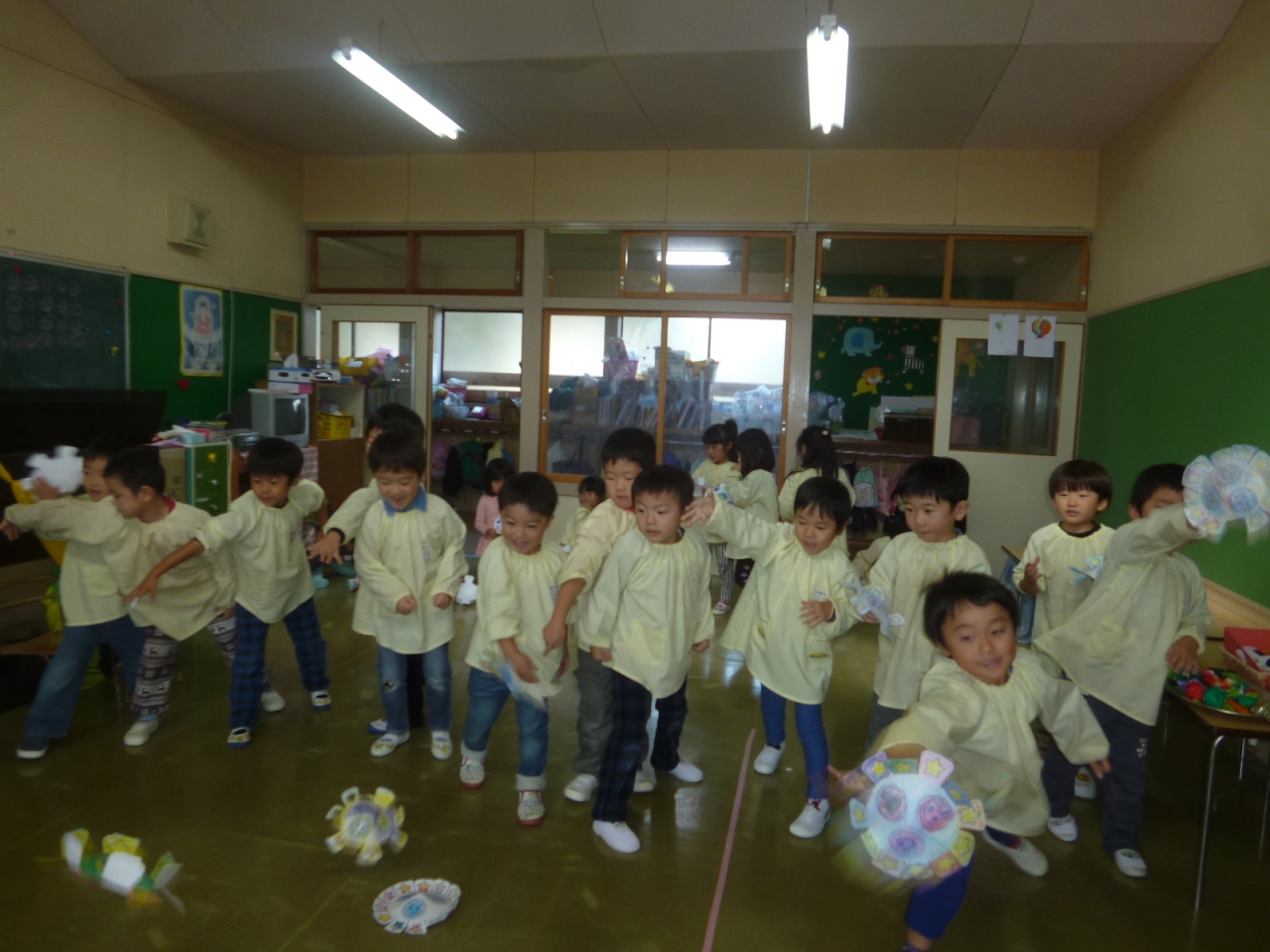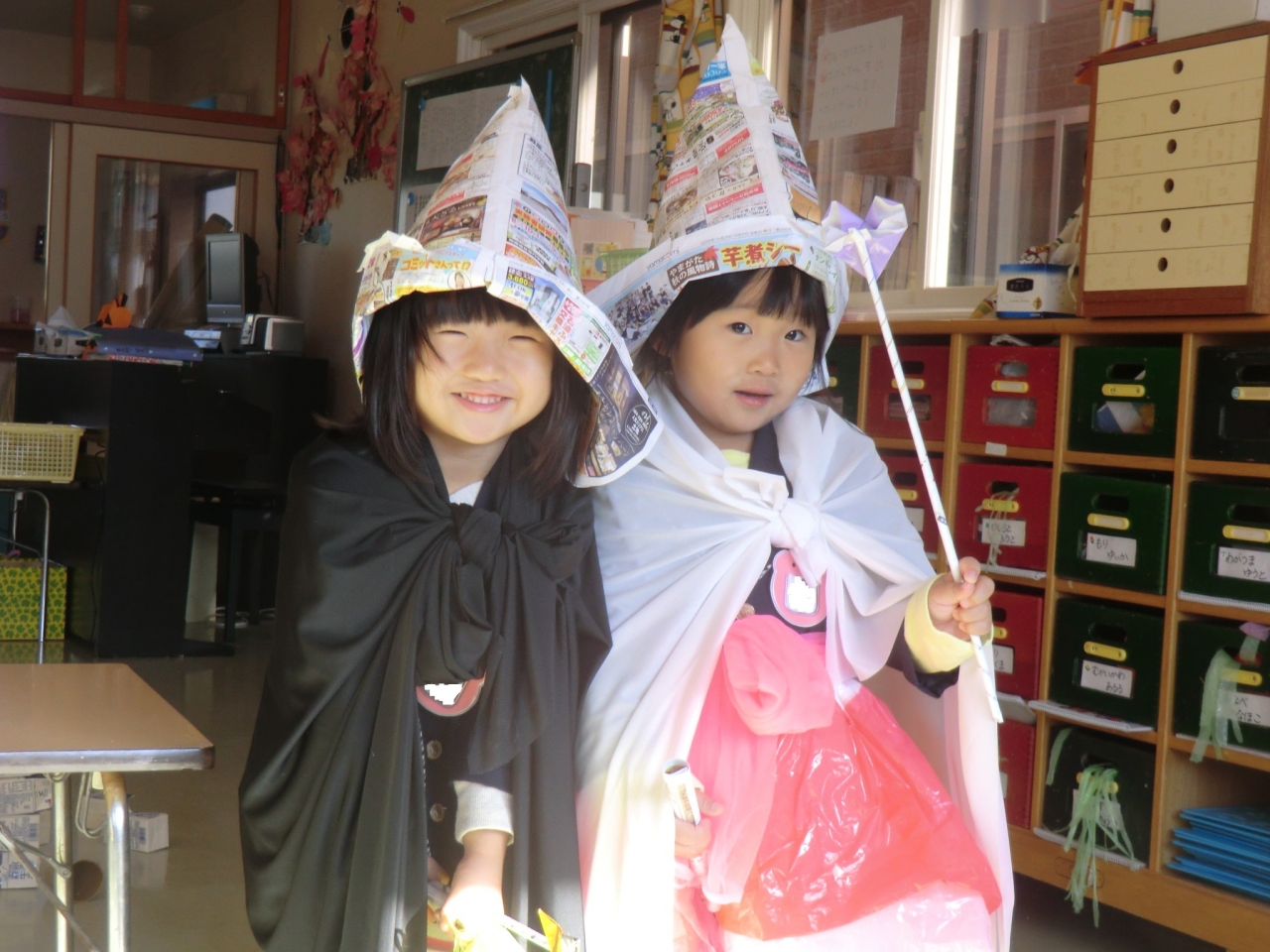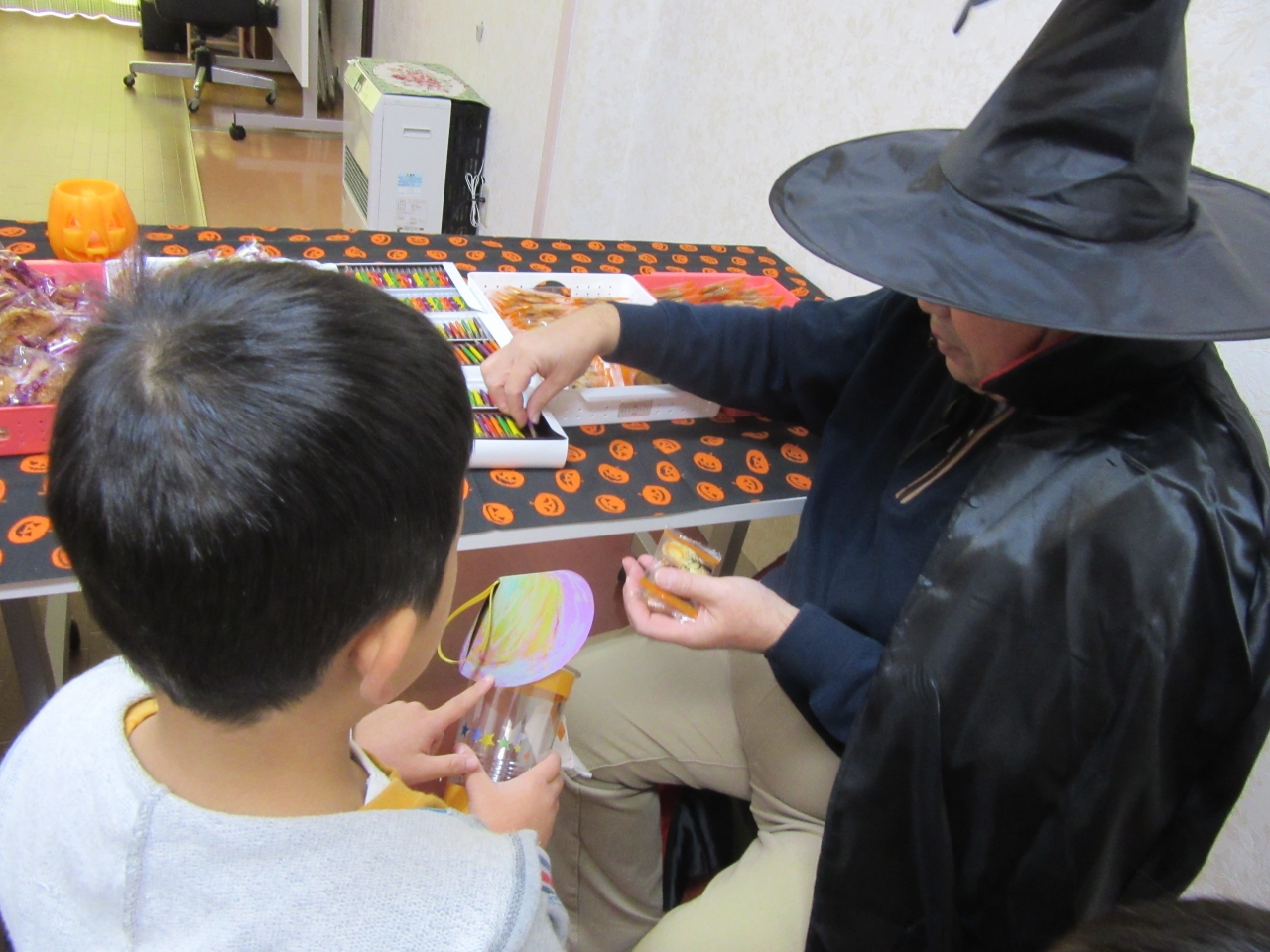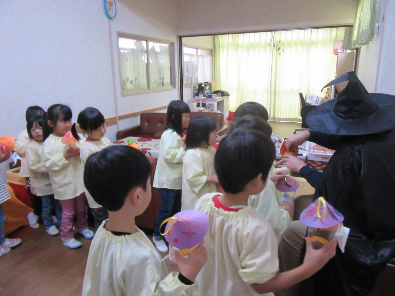 今日は朝からうきうき気分のみんな(*^_^*) HAPPY*ハロウィン~の声が幼稚園中に響き渡ります。でも待って・・まずは大切な避難訓練。そして、年少さんは読み聞かせ会。年中さんから「魔女の館」へ行きます。どきどきの子ども達・・魔女の館の扉をそっと開けると、あれ?どこかで見かけたような魔女さんだね。「お菓子をあげるから悪戯しないでね~」って、くれたけど、優しい魔女さんだったね。