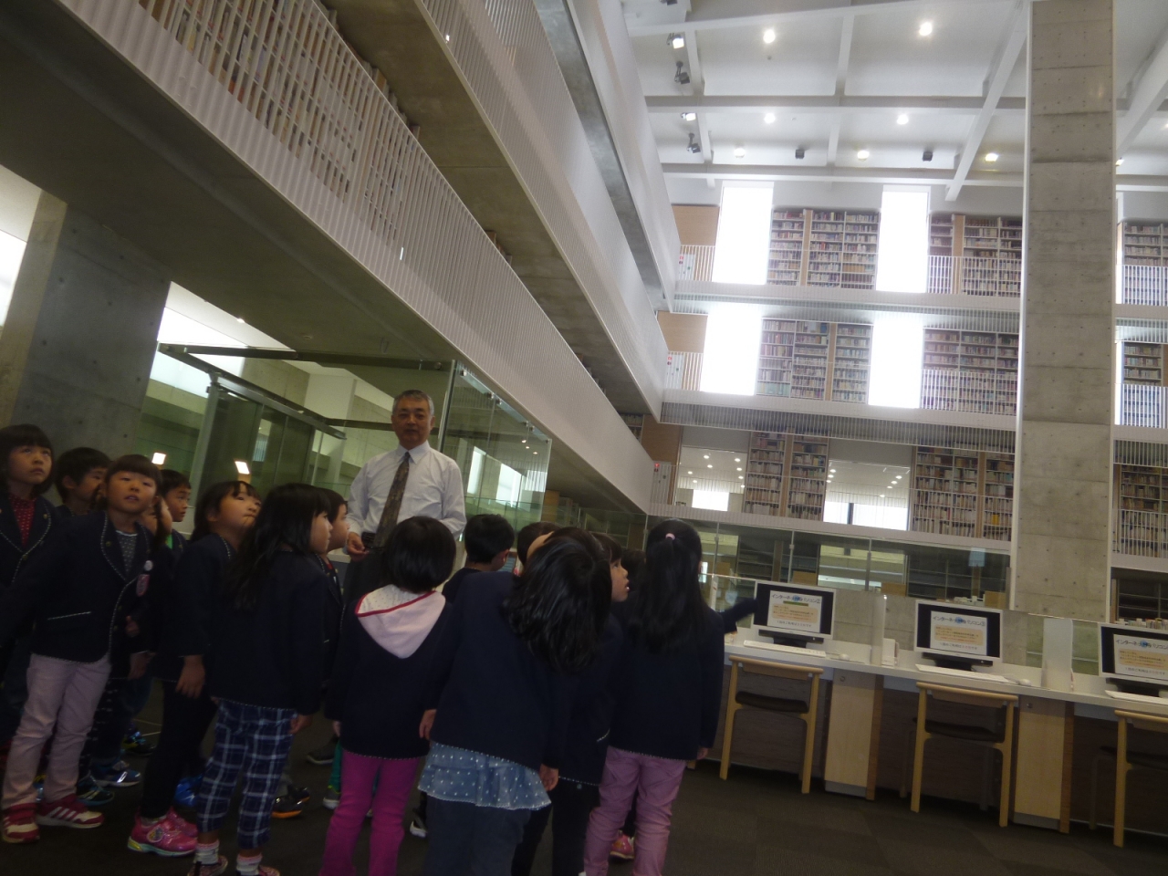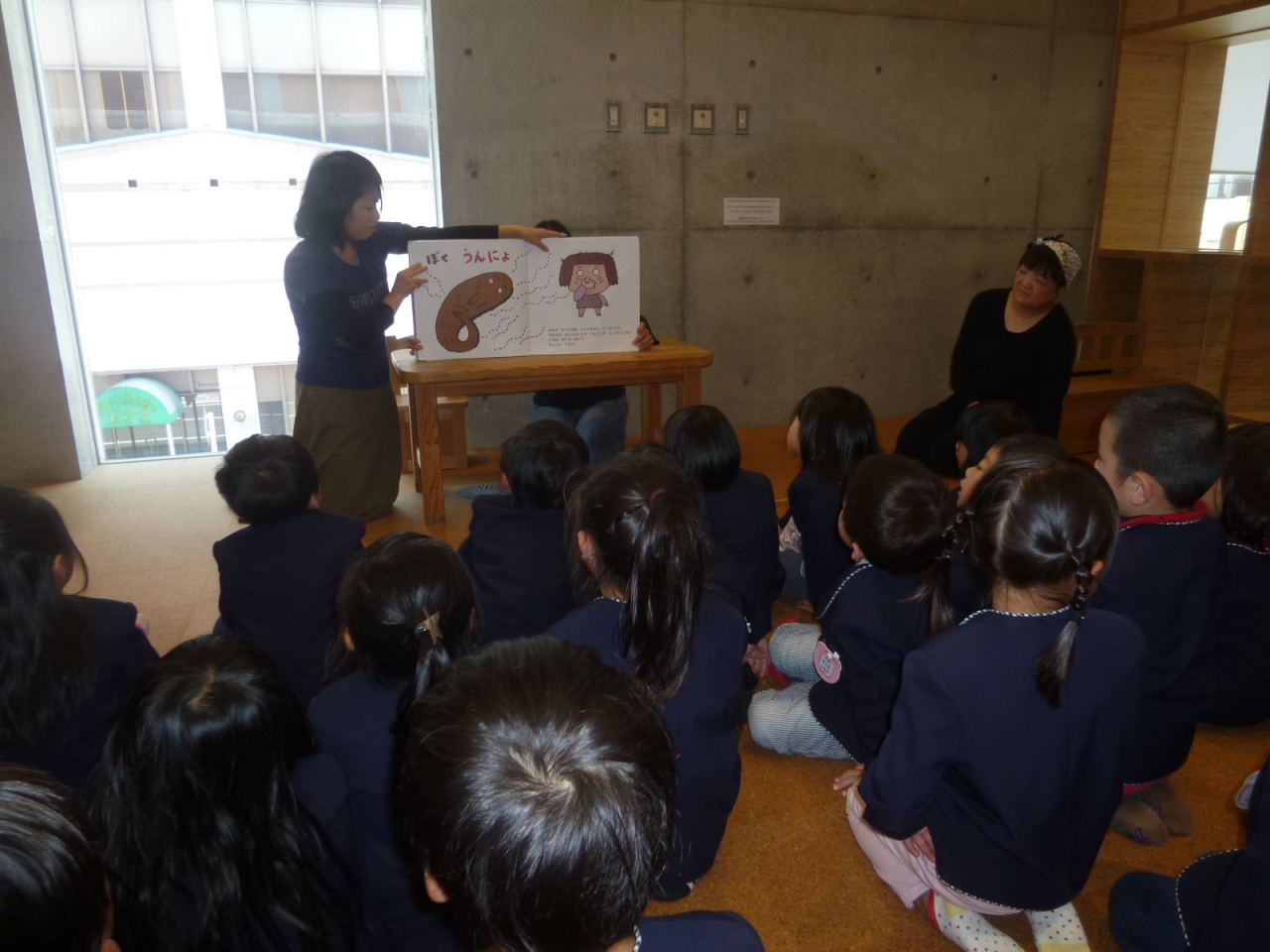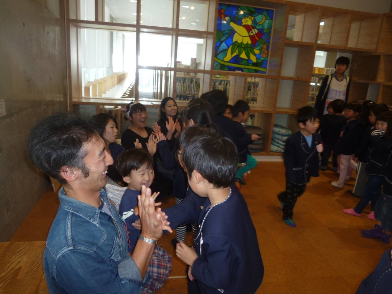 今月は、新しい図書館での読み聞かせ会です。出迎えてくださったのは、スタッフの方々と、それから館長さん!!優しい笑顔で説明をしてくださいました。3階?4階の吹き抜けで、見上げるような本棚・・ たっぷりと用意された絵本のお部屋・・みんな目を丸くして見ていました。読み聞かせ会のお母様方の心に響く絵本の数々に、たくさんの感動とわくわくをいただきました。