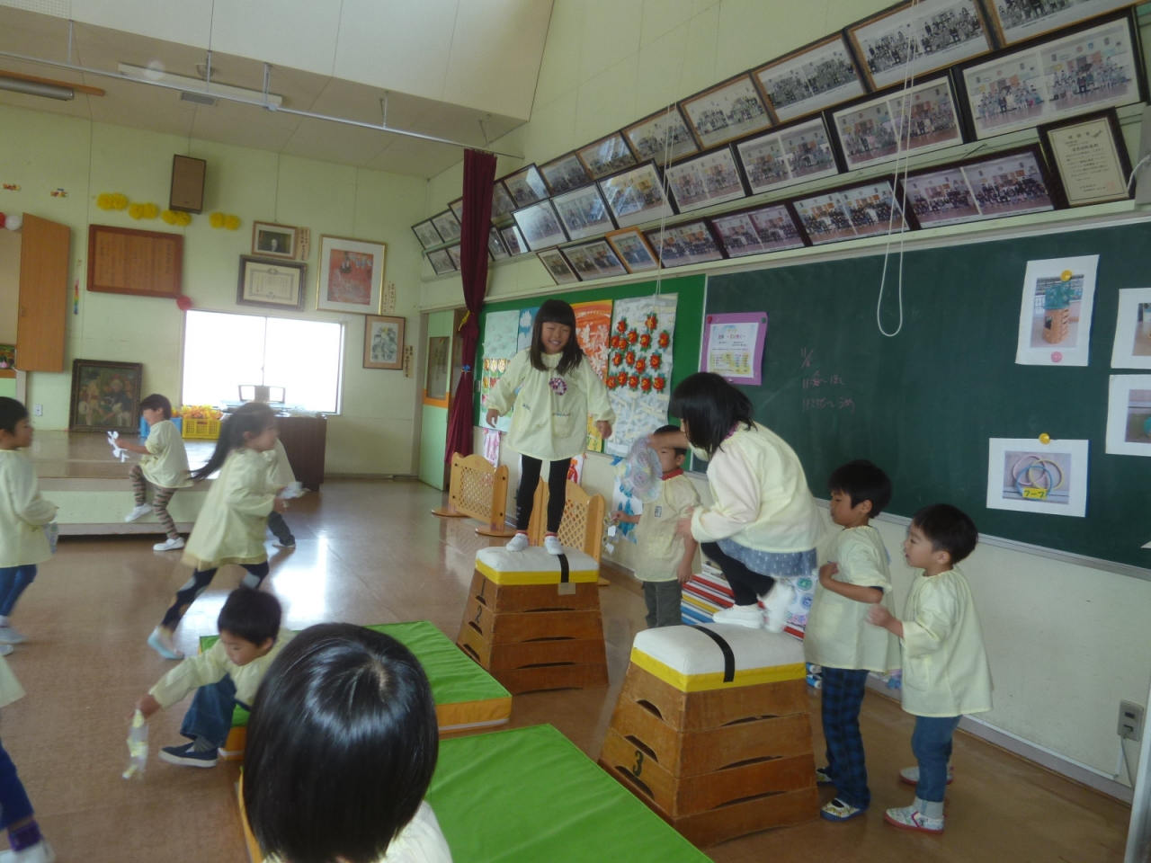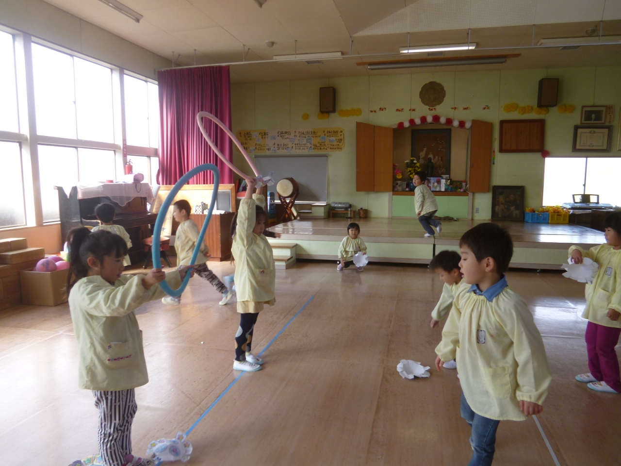 高い所へ登ればいいんじゃない?木のお家?とび箱?ステージ? フラフープの輪の中を通り抜けられるかな?先生~!今度は私が持つから!
