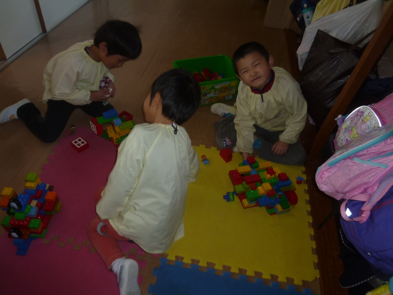 第2弾?おおかみさんを中心とした劇遊びが、広がりつつあります(^・^) 「ぼくたちはブロックがしたいんだ~!」の男の子たちのために、エリアを分けて・・賢くなりました。遊んだ後のお片付けも頑張って♡ たくさん使った布はきちんとたたんでしまおうね。