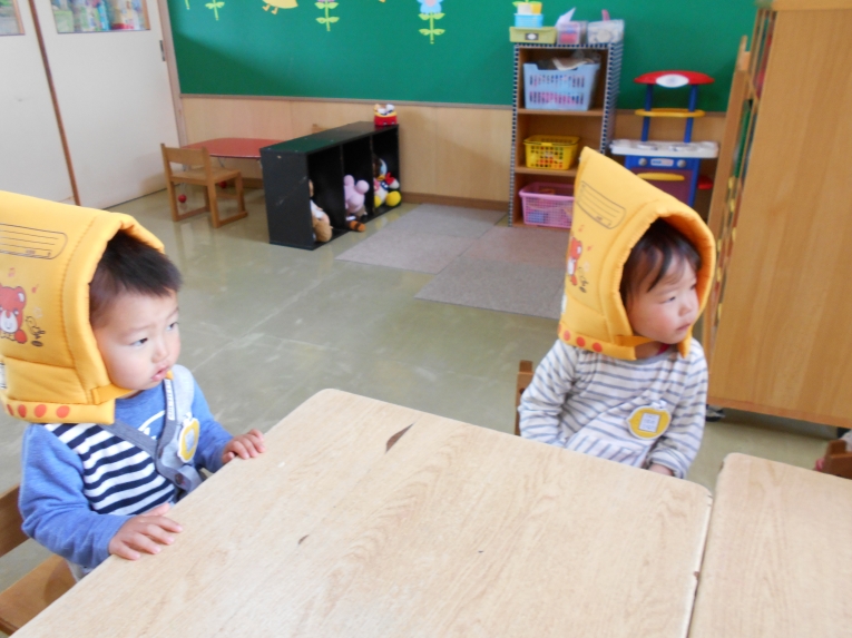 避難訓練があり、防災頭巾をかぶってみました。ちょっとこわいけどがんばったよね