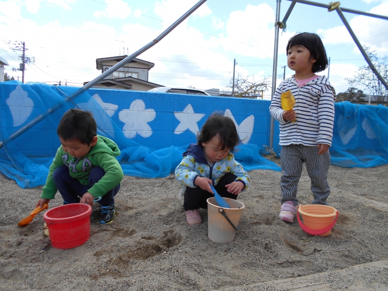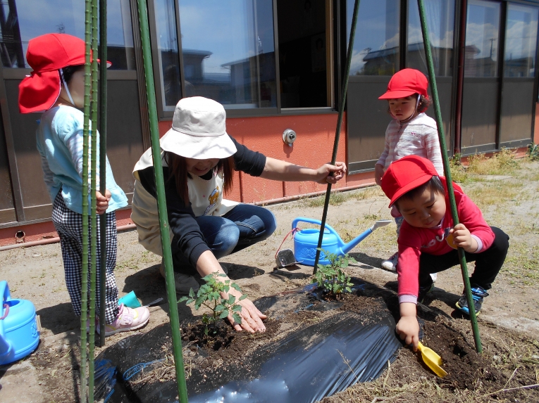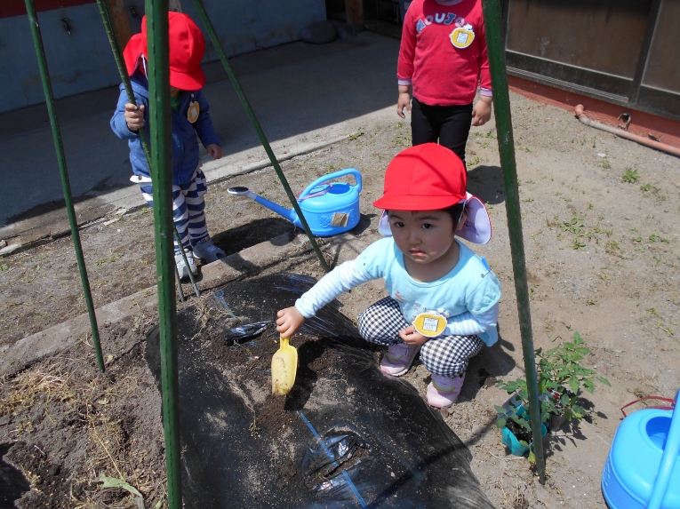 お外あそび大好きなひよこ組さんにぴったりのいい天気が続いていますいよいよすくすく農園の時期が訪れ、ひよこ組では先日ミニトマトの苗を植えました