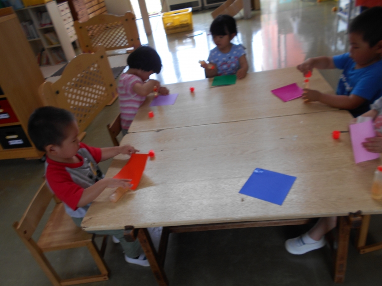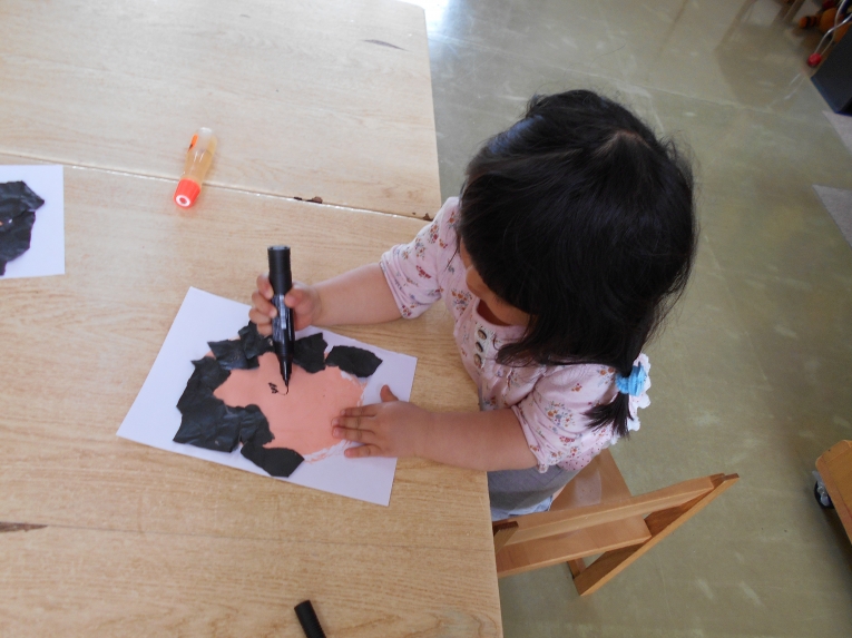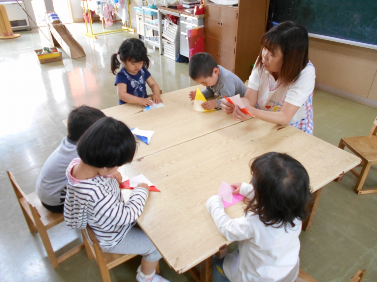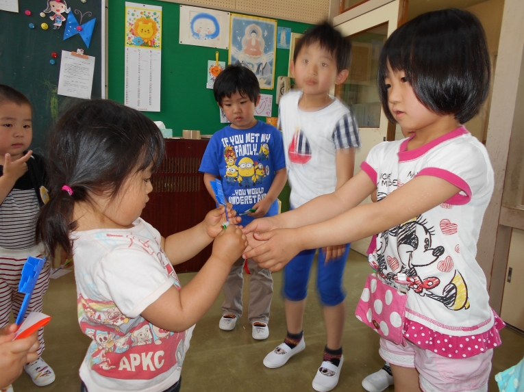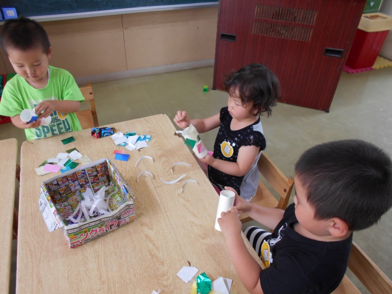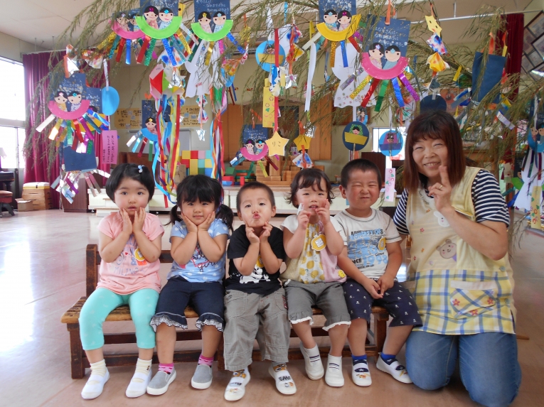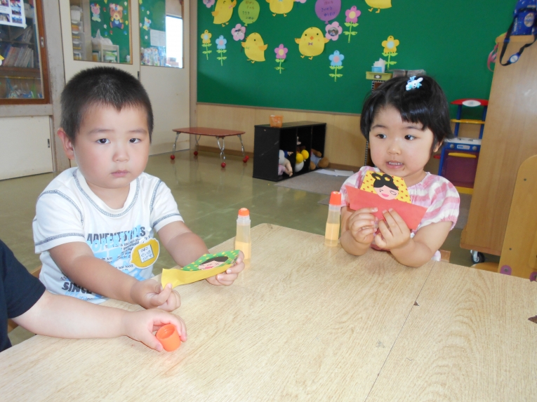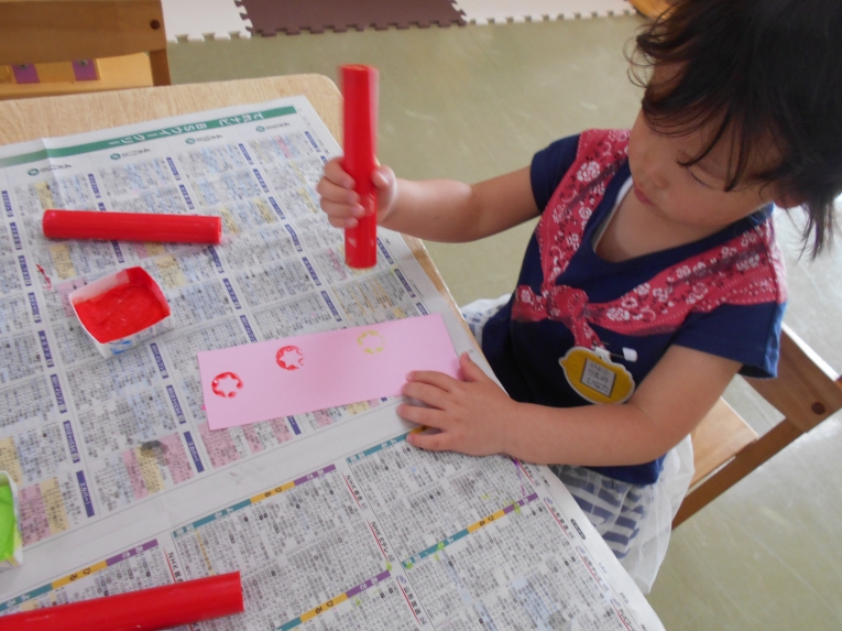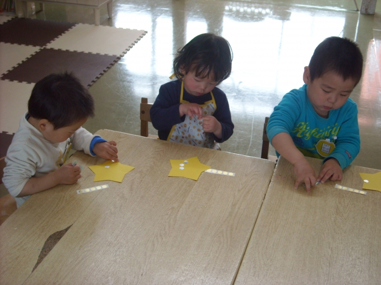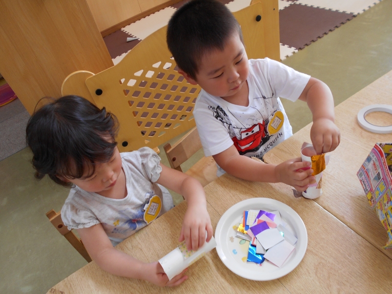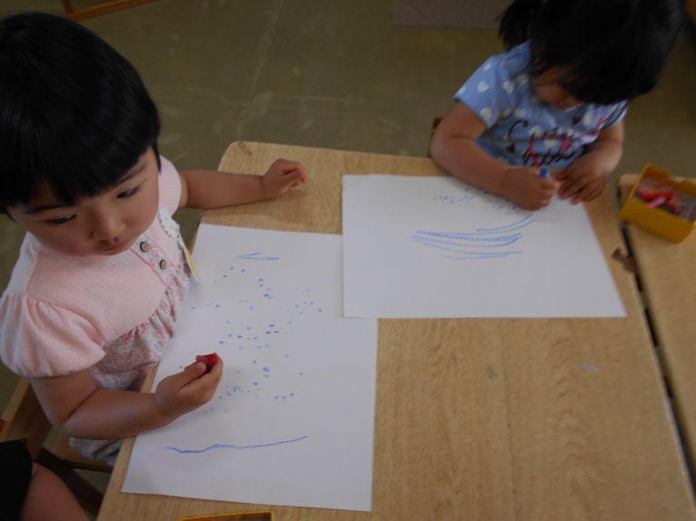 もうすぐその日が来ることを天の織姫と彦星に知らせてあげよう!という導入の元、笹飾りや短冊作りに取り組みました。大きいお兄さんやお姉さんのようにはできないながらも、ひよこちゃんなりのかわいい作品ができました。初めての共同作品??のような飾りもできましたよ